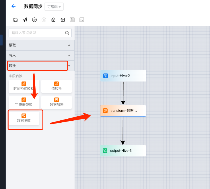 在数据集成模块下创建数据集成任务时,可以在任务配置过程中使用“数据脱敏”转换算子方法来实现脱敏。