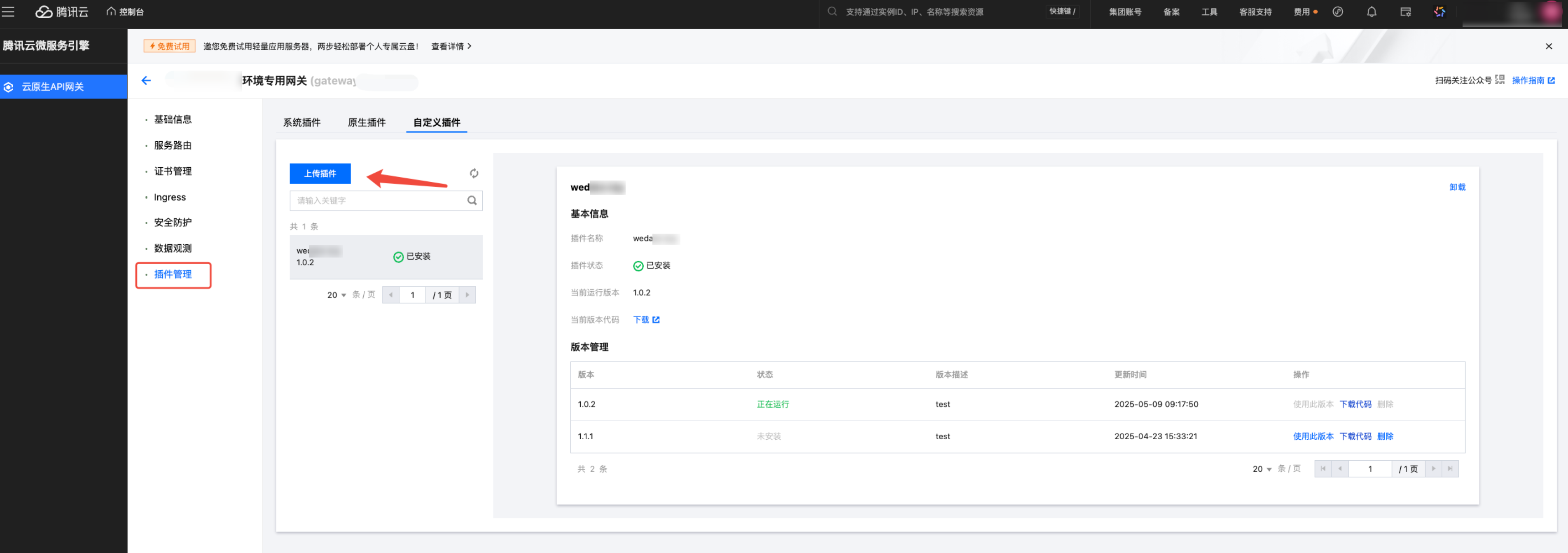 2. 选择需要安装插件的网关实例,并切换至插件管理 Tab,单击上传插件。