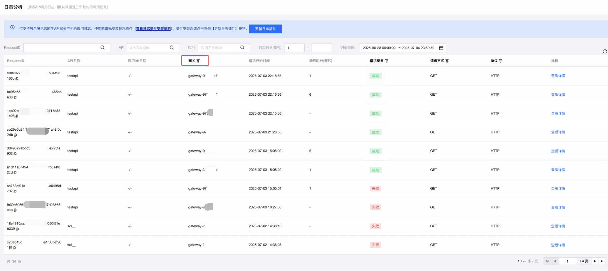 在使用日志分析功能前,需要在 云原生API 网关实例上安装日志插件,目的是将调用的日志上报到 WeData 日志服务器上。
