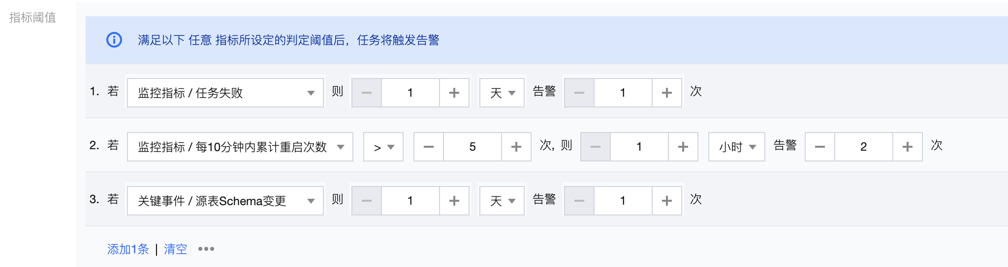 指标阈值 | 实时同步任务目前支持配置任务异常、任务检测异常、每10分钟内累计重启次数、运行期间内写入延时、每20分钟内累计重启次数等17条指标告警。 |