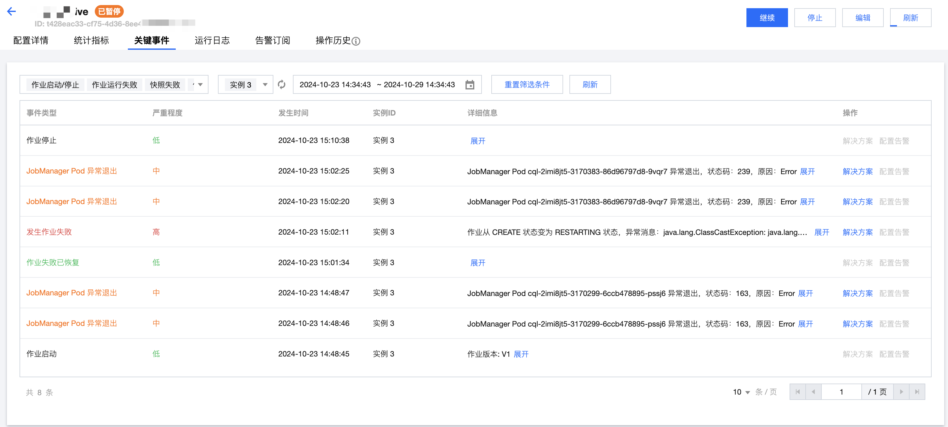 | 指标阈值 | 实时同步任务支持监控指标和关键事件两大类告警指标。 ![]() 1. 监控指标是对任务运行的状态和读写情况进行监控,支持配置任务失败、每10分钟内累计重启次数、作业业务延迟等17条指标告警。 状态指标:任务运行过程中出现失败、停止、异常、暂停、重启等情况达到一定的数值时触发告警。例如: 任务暂停:任务暂停超过累计时长后告警 任务停止:任务手动或被动停止后立即触发告警 任务失败:任务运行状态为失败时立即触发告警 任务异常/任务检测异常:任务在运行过程中出现异常立即触发告警 任务重启:任务重启超过累计次数后立即触发告警 注意: 此处的任务状态和关键事件中的作业状态为不同的概念,例如关键事件中发生作业失败事件不代表任务状态为失败,因为任务配置了重启策略,作业失败后会进行重启,任务状态还是运行中,直到达到重启次数限制任务状态才变为失败,此时才会触发任务失败告警。如果任务没有限制重启次数,建议配置每10分钟内累计重启次数告警,不建议配置任务失败告警。 读写指标:支持通过读取/写入速度、任务写入延时、读取/写入吞吐、脏数据字节/条数超过定义的值立即触发告警。 2. 关键事件是对任务运行过程中出现的核心事件进行监控告警。目前仅支持源表 Schema 变更事件,其他事件类型待后续支持。 ![]() |