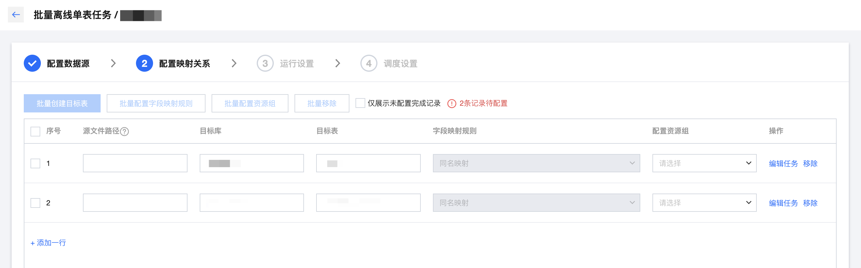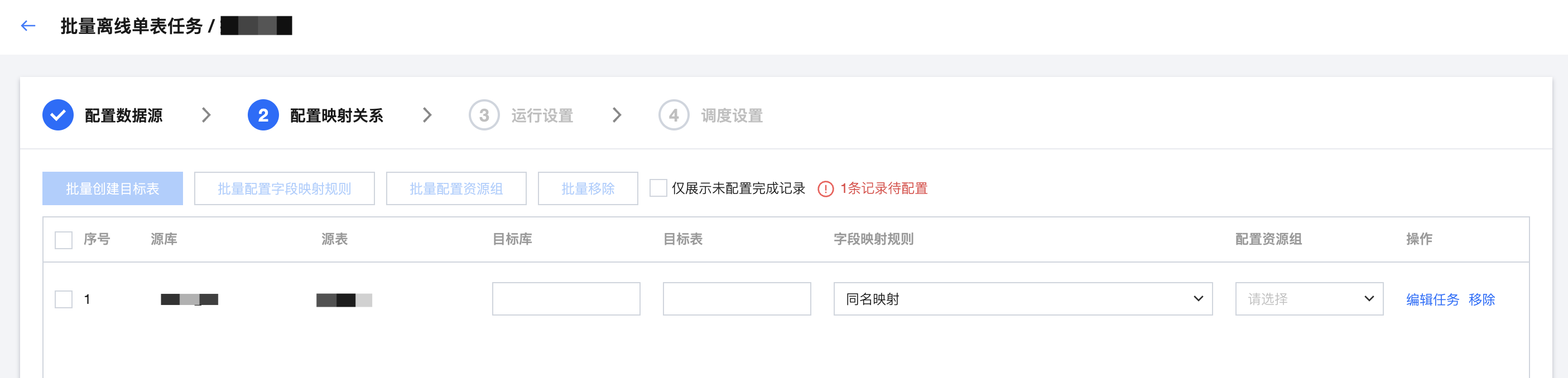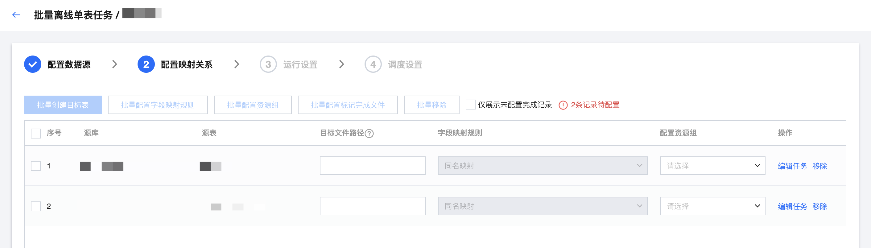 批量创建目标表 | | 勾选列表后,可批量创建写入端的数据表。 确认建表规则:确认建表信息如数据来源、来源库等,支持预览/编辑表语句。 批量建表:展示建表结果,支持查看建表语句、重试。 ![]() |