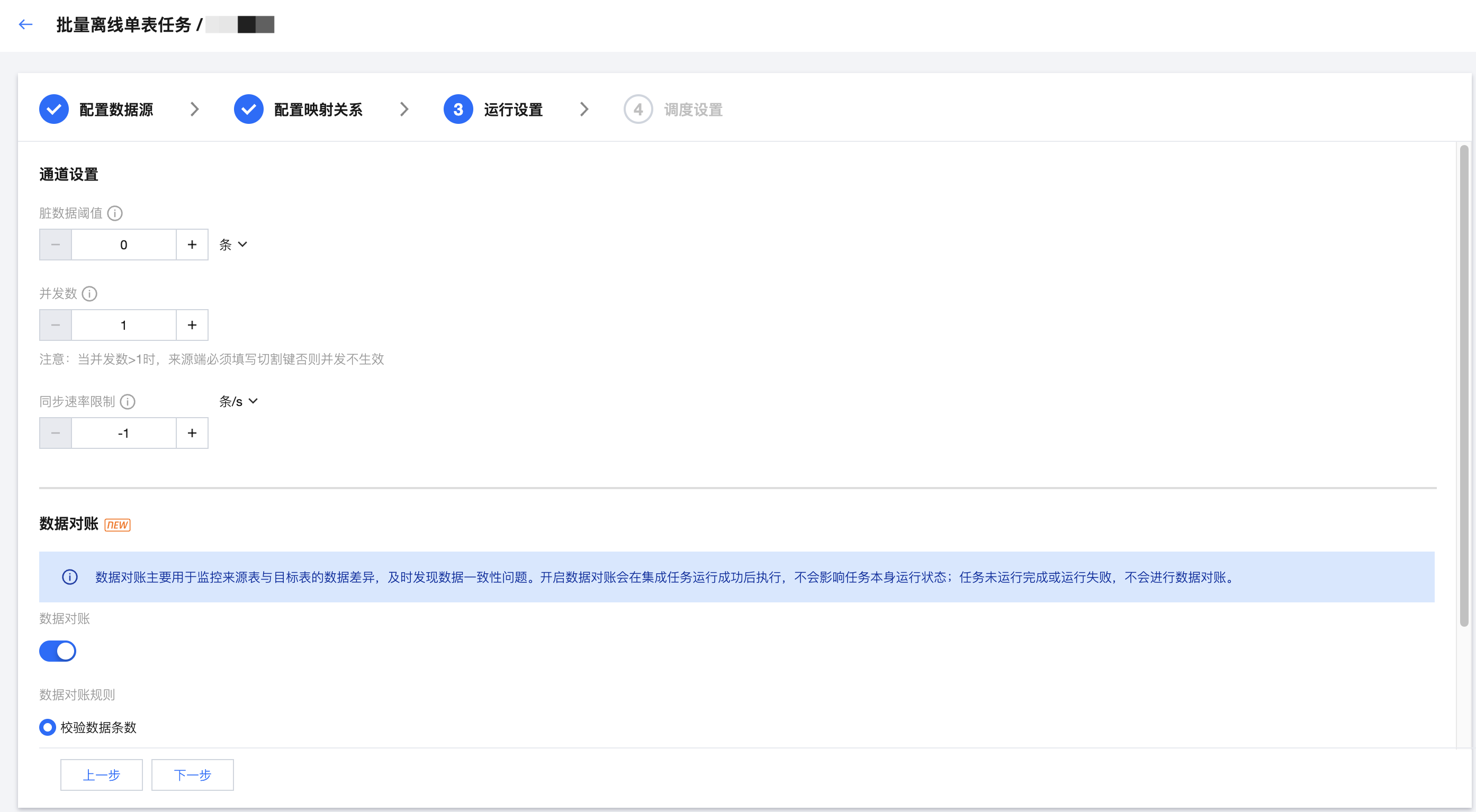 同步速率限制 | | 按照流量或记录条数限制同步速率以保护数据来源端或者数据去向端的读写压力。该值为最大运行速率,默认-1表示不限制速率。 |