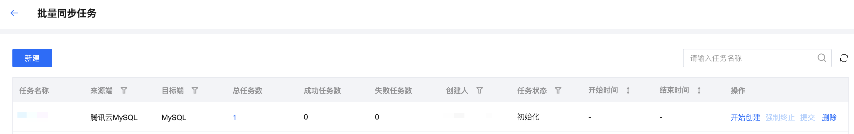 | 强制终止 | 强制终止创建中的批量任务,终止后已创建的任务不会回退,未完成的任务不再创建,未完成的任务统计在失败任务数中。 |