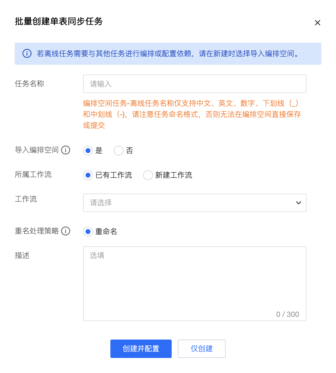 5. 单击新建后,即可进入批量创建单表同步任务配置页面,填写任务名称和描述后,单击创建并配置。