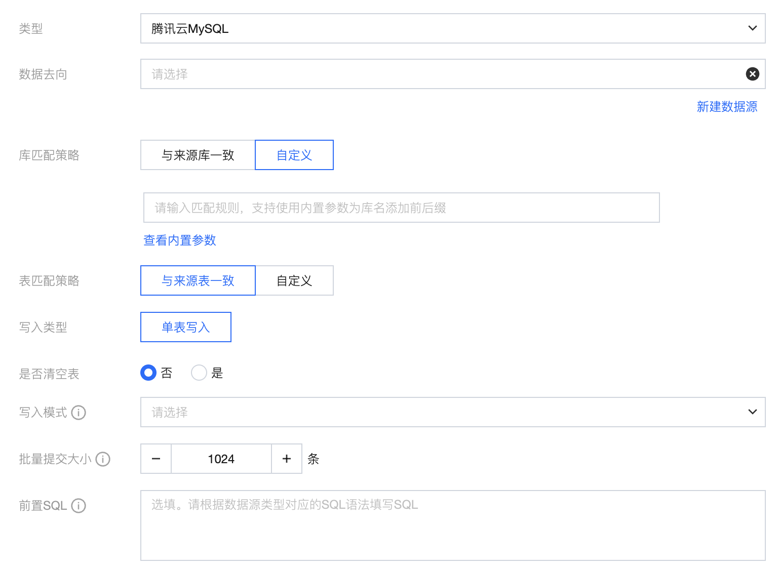 写入端支持的数据源类型:MySQL、TDSQL-C MySQL、TDSQL MySQL、TDSQL PostgreSQL、TCHouse-P专有云、PostgreSQL、Oracle、SQL Server、IBM DB2、达梦DM、SAP HANA、Doris、HBase、Hive、Kudu、Greenplum、ClickHouse、GaussDB、GBase、Tbase、Impala、Vertica、COS、HDFS、FTP、SFTP、S3、Iceberg、StarRocks。