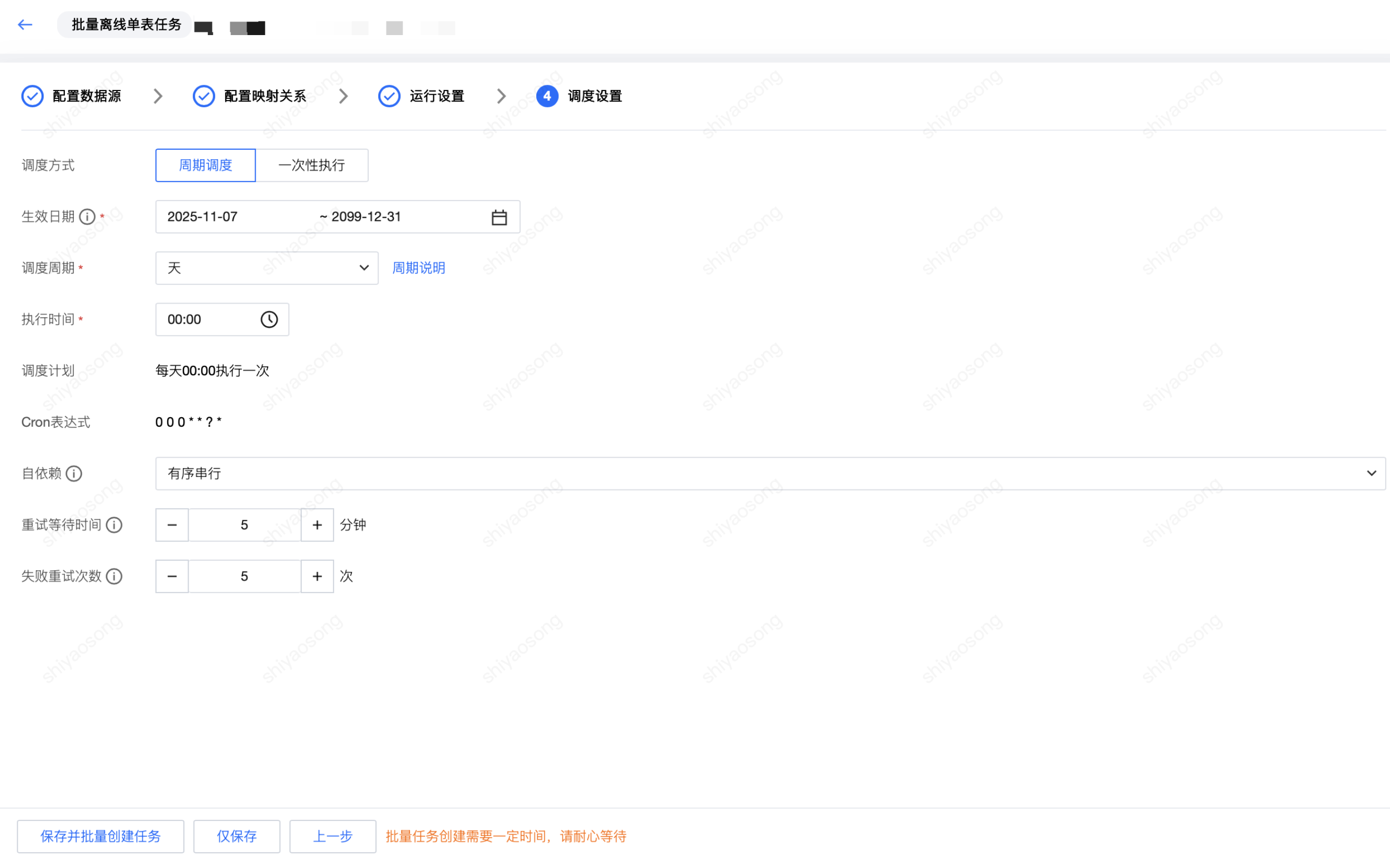 仅保存 | | 生成批量创建任务本身,但不开始创建单表同步任务。 |