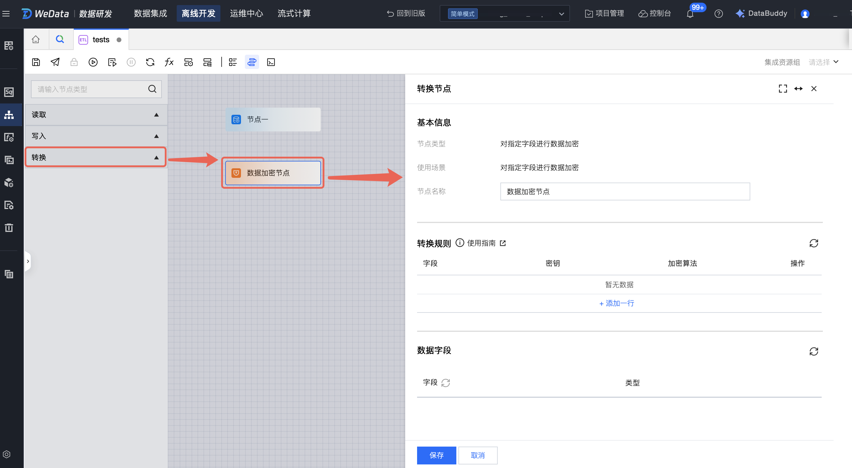 在左侧目录中,从转换节点选择所需的转换类型拖拽至画布中,双击节点图标进行配置。转换节点配置包括基本信息、转换规则、数据字段三部分。其中,转换必须作为读取节点下游,在创建与读取节点连线后系统将自动获取上游节点内字段信息,同时根据转换规则完成数据转换。
