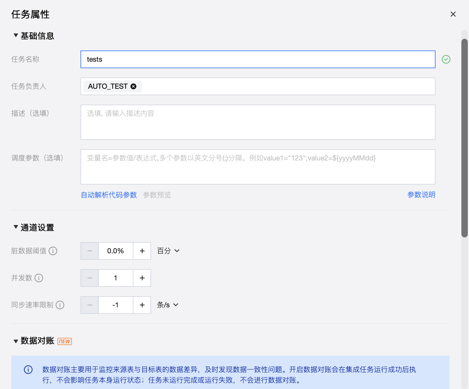 设置任务基本属性、使用资源以及数据链路通道、数据对账等信息。