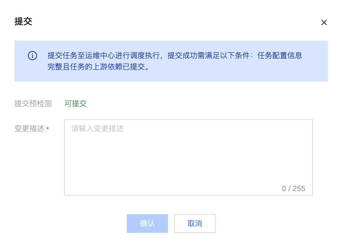数据工作流每次编辑后提交运维,相应的就会生成一个工作流版本。确认无误后,在变更描述栏填写适当内容,即可将离线同步任务发布到运维阶段。