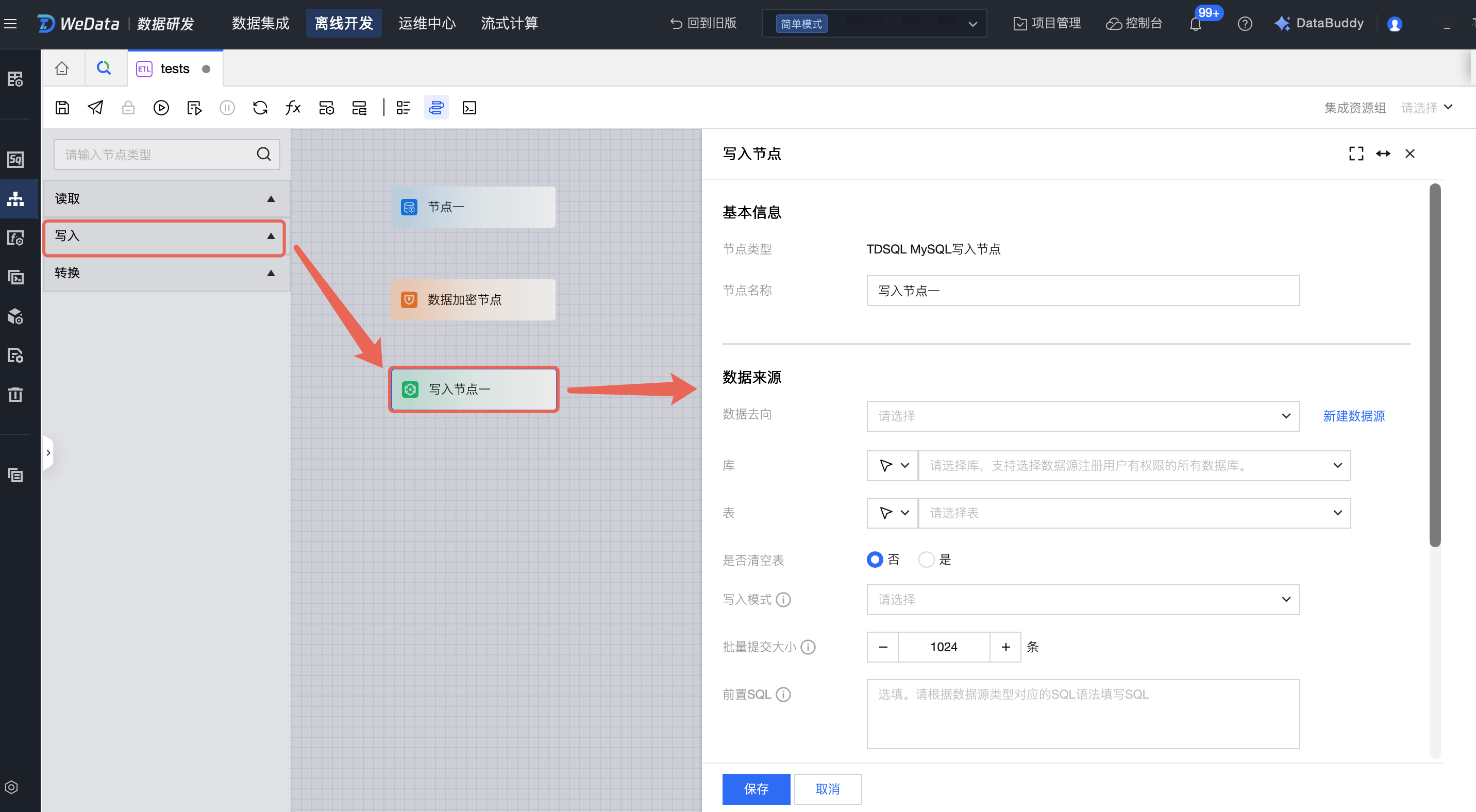 在左侧目录中,从写入节点选择所需的数据源拖拽至画布中,双击节点图标进行配置。