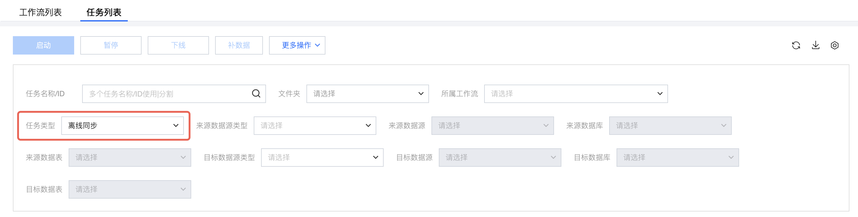 单击任务列表进入列表页面,任务类型选中离线同步,即可查看在编排空间提交的离线同步任务。