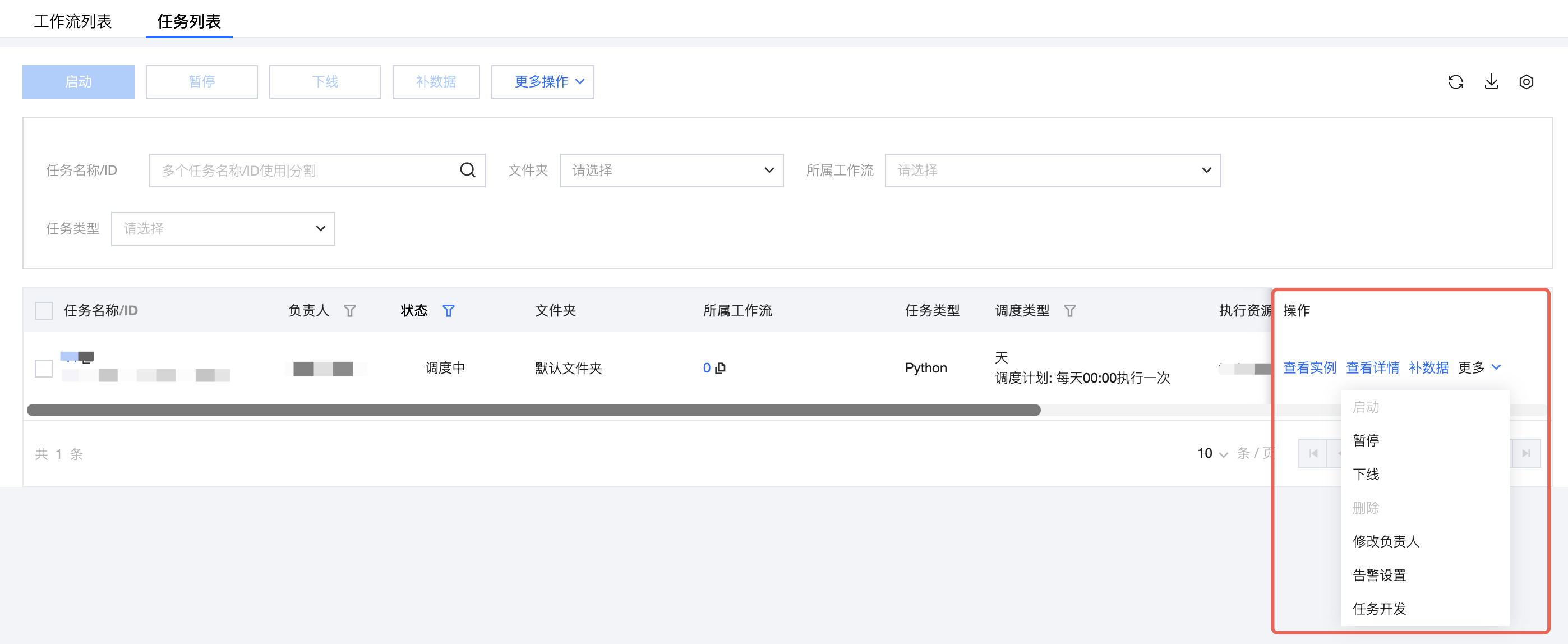 启动 | 分为批量操作和单任务操作,批量操作在任务名称前进行勾选,再使用上方的功能按钮;单任务操作点击任务列表操作列的操作项。 仅对任务状态为“已暂停”的任务有效。启动任务后,任务会处于正常调度状态,并按调度周期生成实例。 |