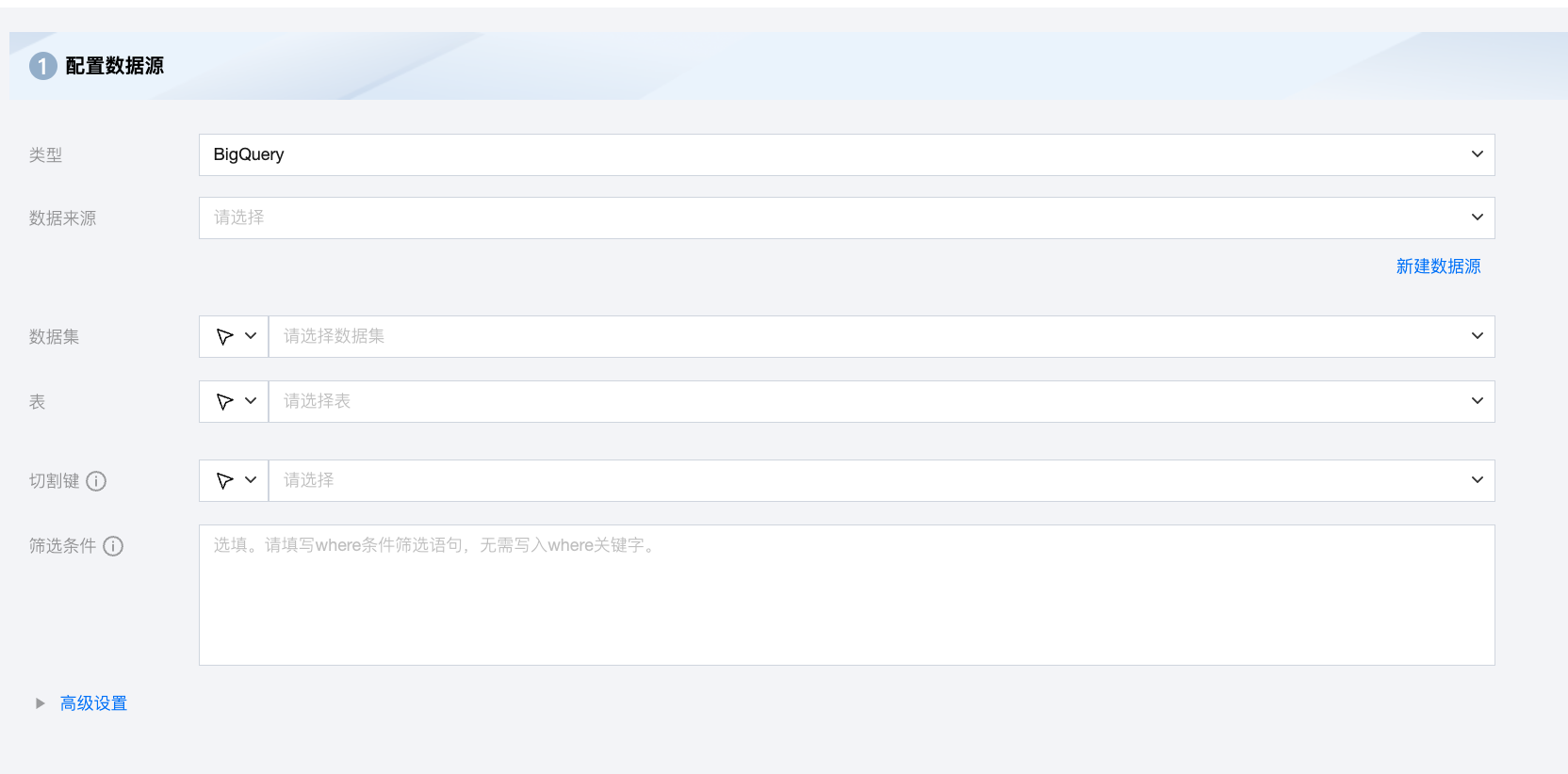 数据来源 | 选择来源端的已配置 BigQuery 数据源。 |