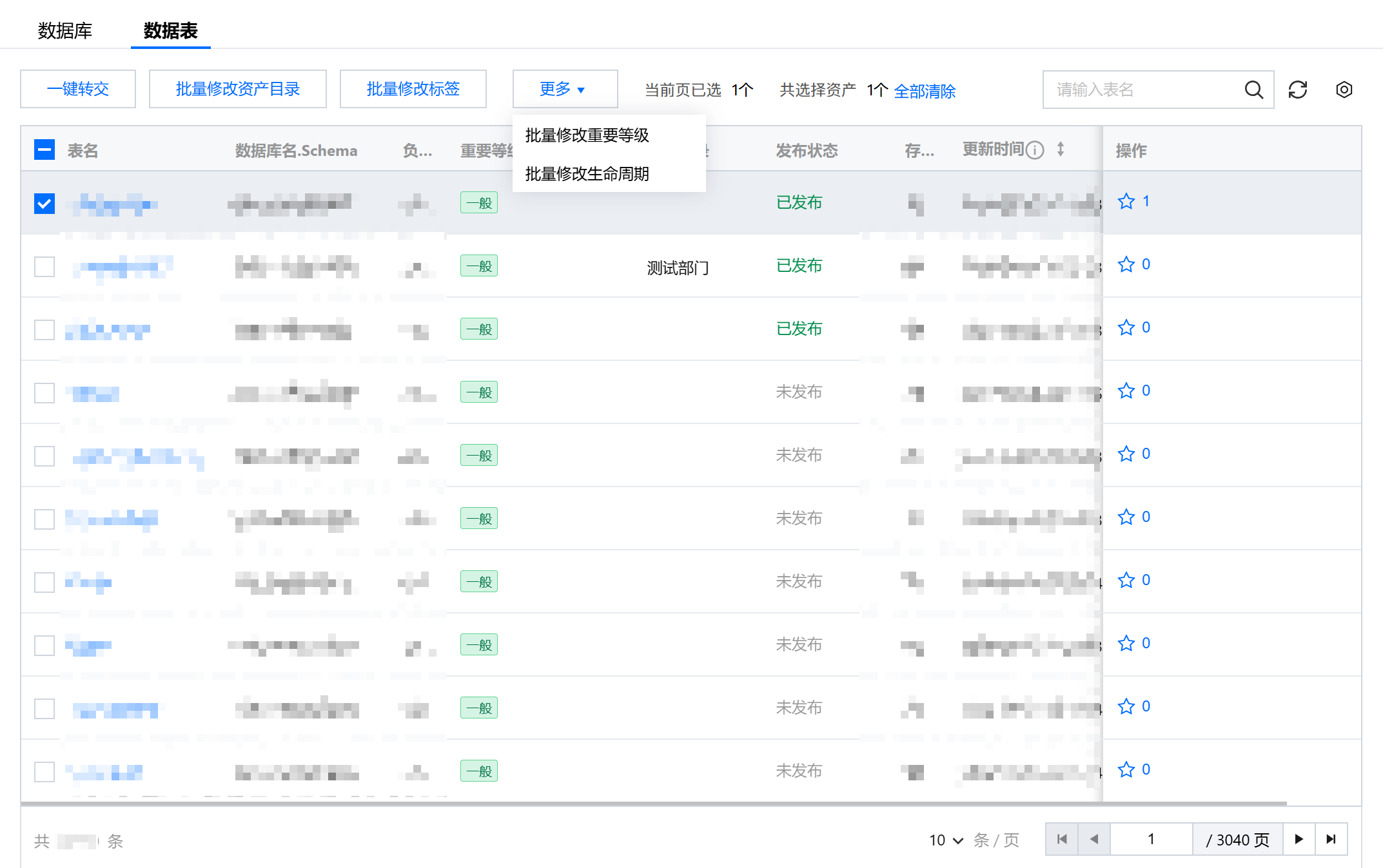 表列表同时支持资产盘点中的批量操作,例如,一键转交、批量修改资产目录、批量修改标签、批量修改重要等级、批量修改生命周期、收藏。