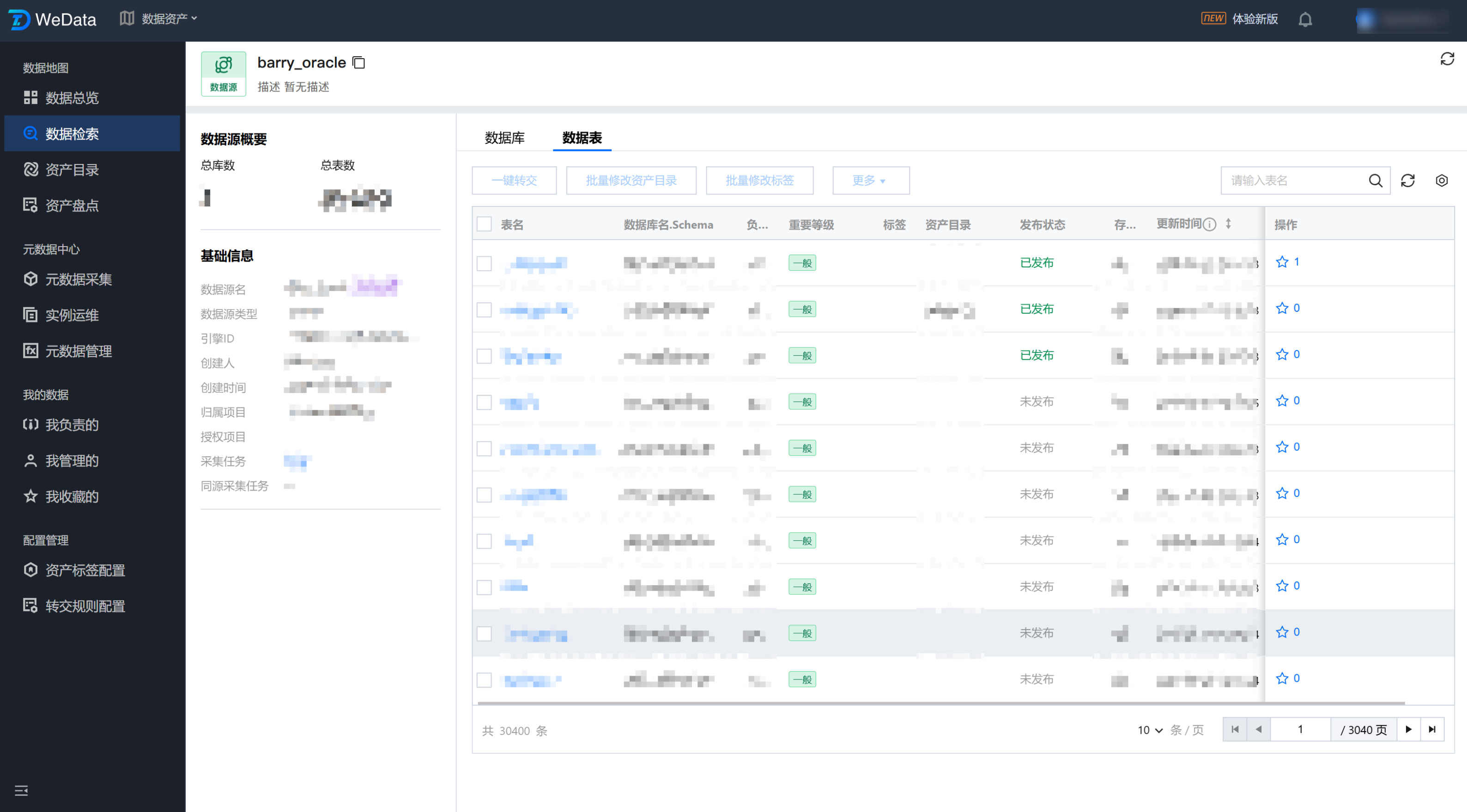 表列表主要展示了该数据源下所有数据表名称、数据库名 .Schema、负责人、重要等级、标签、资产目录、发布状态、存储量、以及其更新时间。点击表名后,将会跳转至表详情页面。