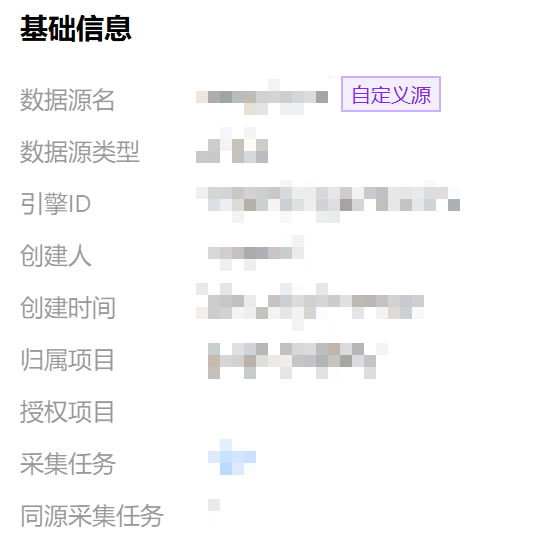 基础信息主要展示了数据源名、数据源类型、引擎ID、创建人、创建时间、归属项目、授权项目、采集任务、同源采集任务等信息。同时,点击采集任务的链接可以跳转对应采集任务的详情。