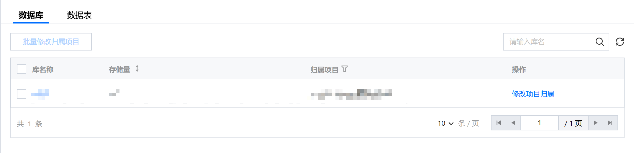 库列表主要展示了该数据源下所有数据库名称,储存量以及其归属项目。您可以在此批量修改该数据源下数据库的归属项目。点击库名称后,将会跳转至该库的数据库详情页面。