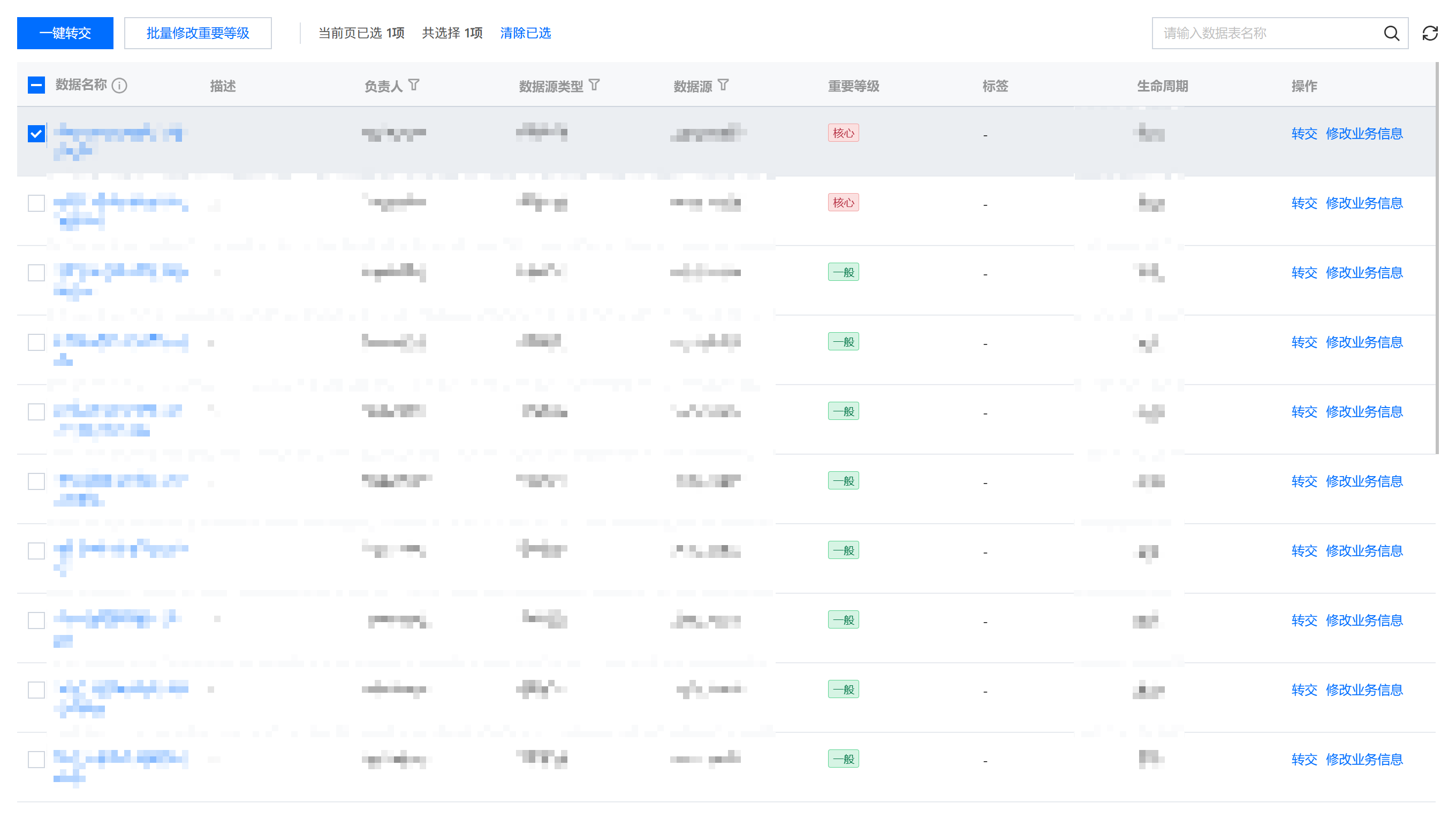 数据表 Tab 页面展示当前用户为负责人的所有表,包括:数据名称(以数据库名称、数据表名称展示)、描述、负责人、数据源类型、数据源、重要等级、标签及生命周期。