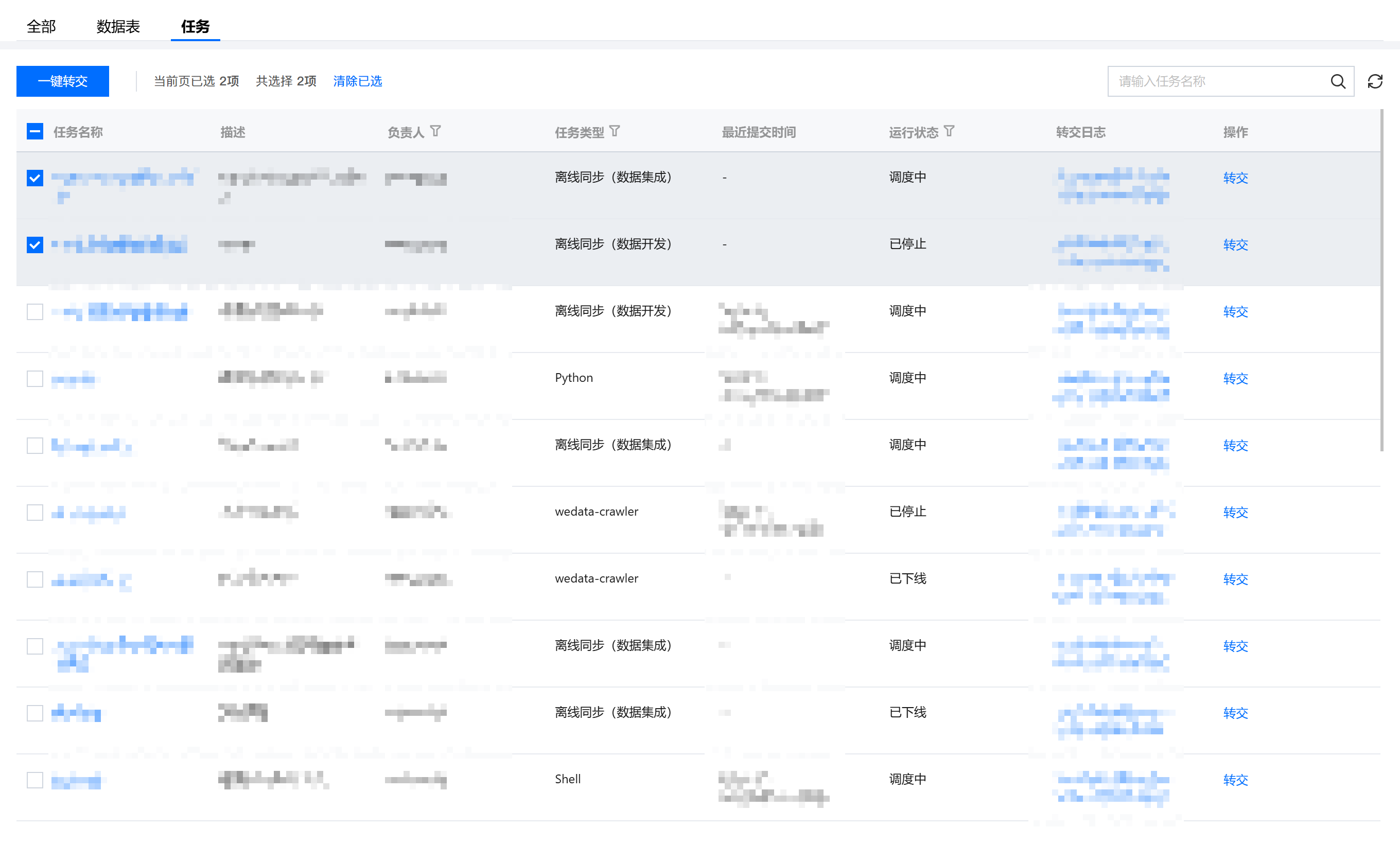 任务 Tab 页面展示当前用户为负责人的所有任务,包括:任务名称(单击可跳转该任务所在页面)、描述、负责人、任务类型、最近提交时间、运行状态。