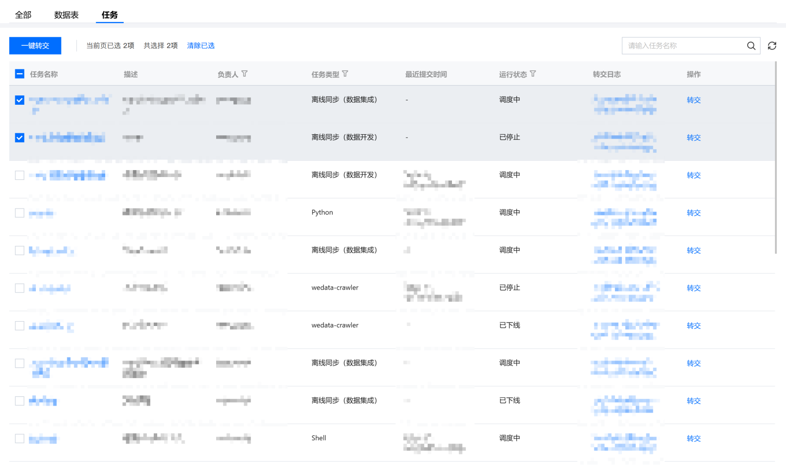 任务 Tab 页面展示当前用户为项目管理员管控的任务,包括:任务名称(单击可跳转该任务所在页面)、描述、负责人、任务类型、最近提交时间、运行状态。