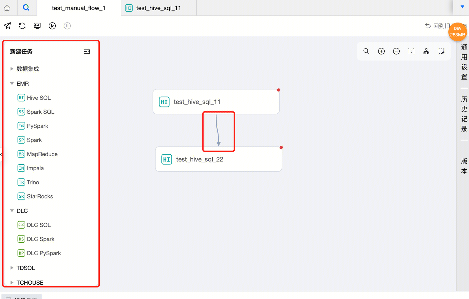 2. 完成任务创建后,可在工作流画布中连接任务,建立任务的上下游依赖关系。