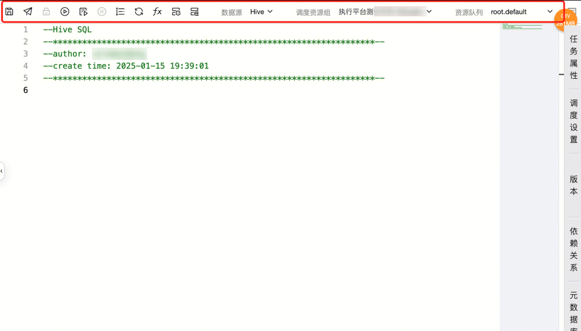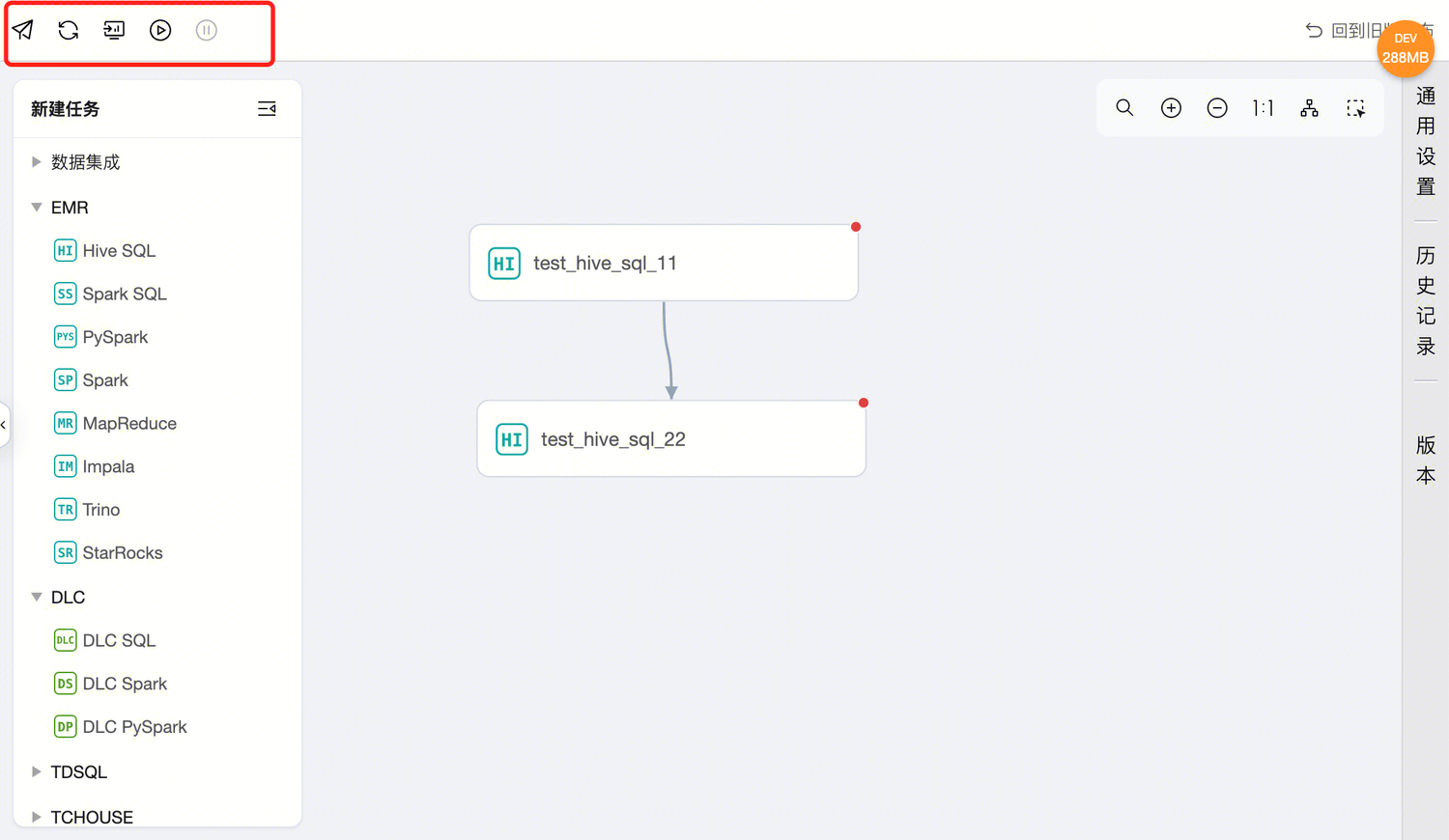 可进行保存、提交、抢锁、测试运行、高级运行、停止运行、格式化、刷新、查看项目参数、任务运维(跳转到手动工作流列表)、实例运维(跳转到手动工作流操作记录)。
