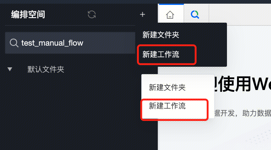 1. 进入编排空间,单击上方 + 按钮并选择新建工作流或在文件夹的更多操作中选择新建工作流。