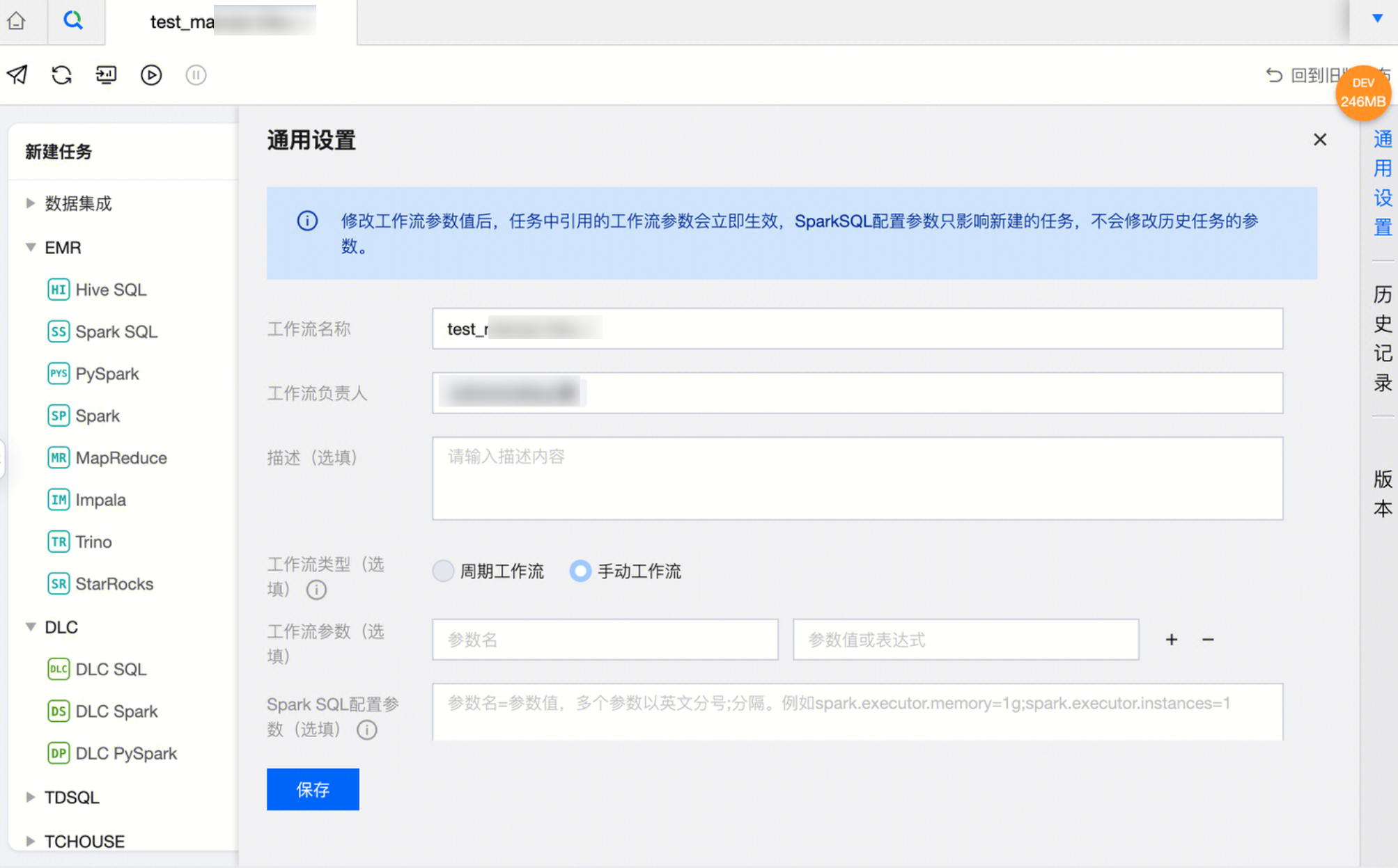 3. 单击右侧通用配置,可设置手动工作流的工作流名称、工作流负责人、描述、工作流类型(工作流一旦创建,则不支持修改类型)、工作流参数、Spark SQL 配置参数。