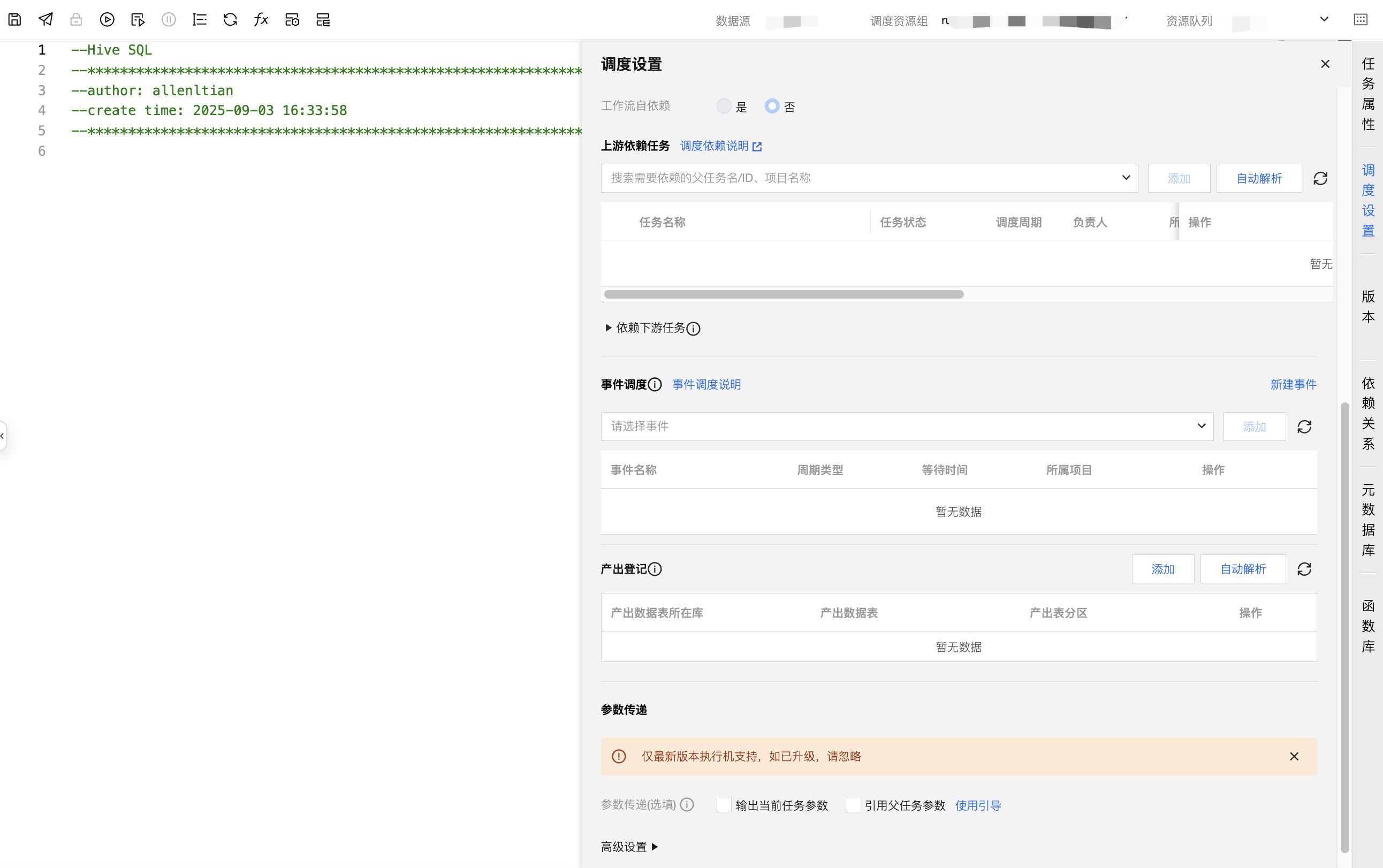 支持配置依赖关系、参数传递、高级设置(任务调度优先级、失败重试配置、超时处理策略),手动工作流下的任务可建立依赖关系,不同手动工作流间不支持配置依赖关系,手动工作流和周期工作流间也不支持配置依赖关系,即手动工作流下任务的上游依赖只支持选择同工作流下的任务。