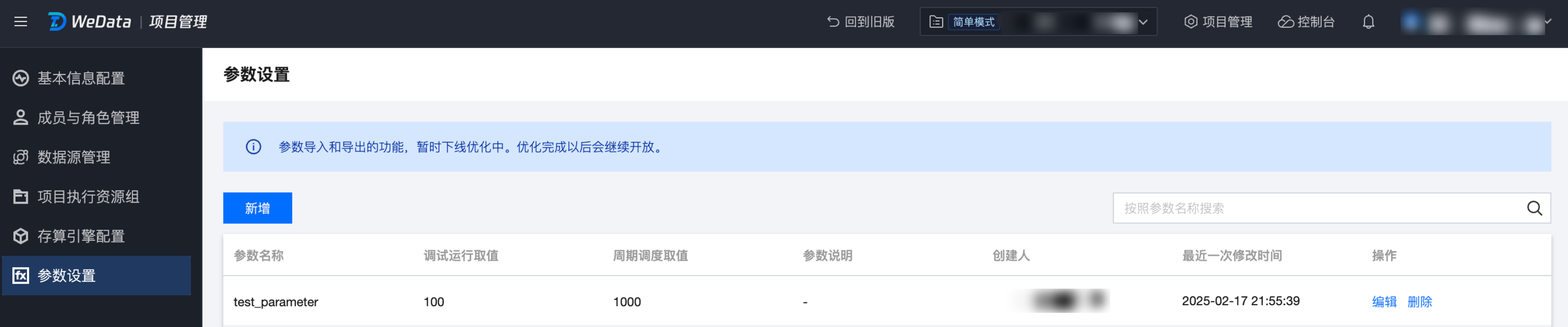 1. 进入项目管理 > 参数设置界面,单击新增,完成项目参数的新建。