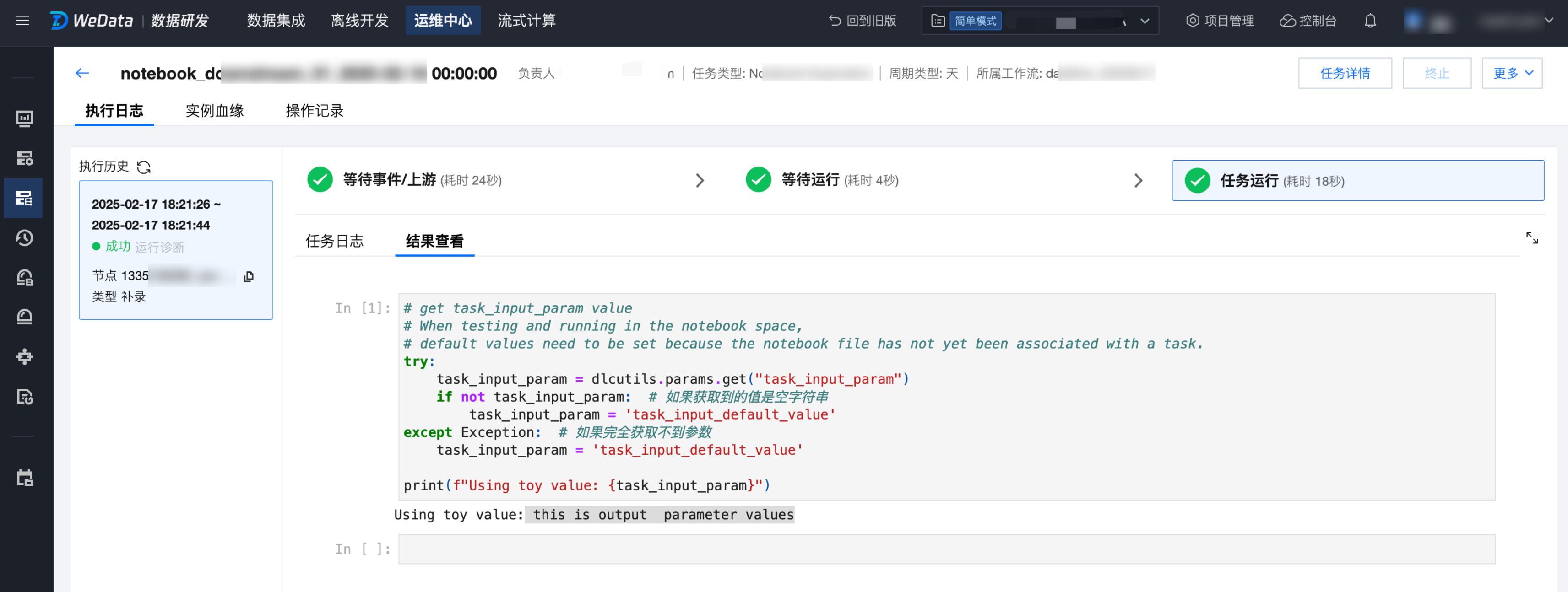 5. 最后,在工作流调试运行或者调度运行中,即可查看 notebook_downstream_01 的输出为 this is output parameter values。