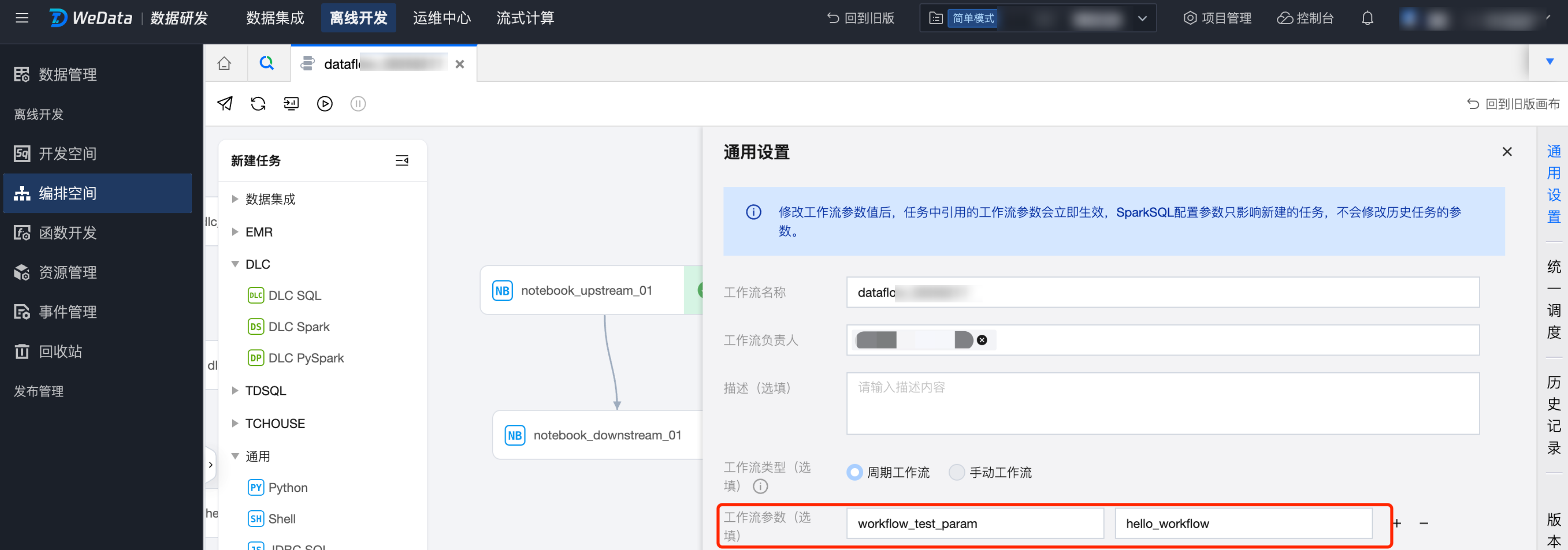 例如,任务上配置了任务参数 task_test_param,任务的工作流中配置了 workflow_test_param。