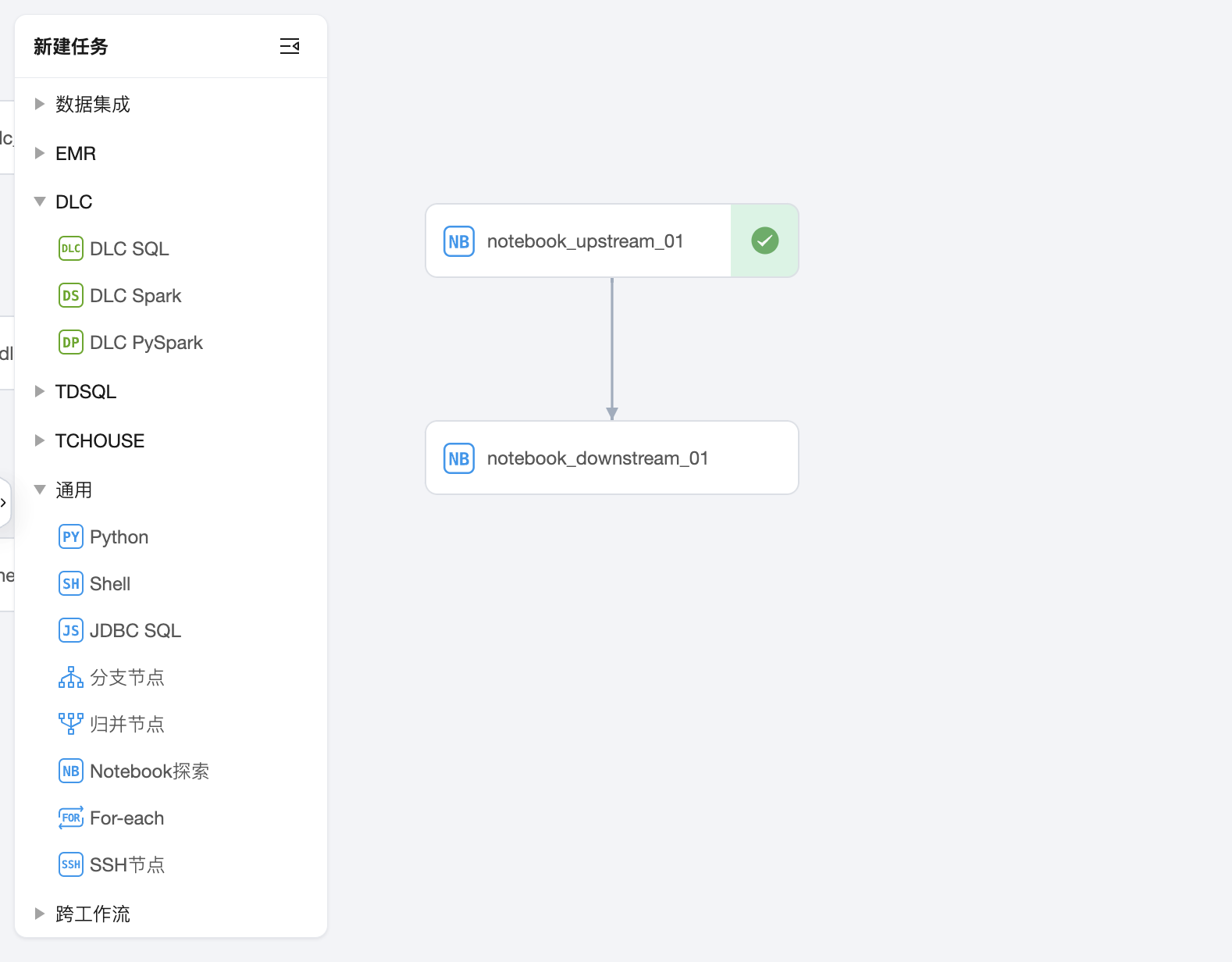 2. 同时,在编排空间创建两个任务 notebook_upstream_01、notebook_downstream_01,分别选中上面两个 notebook 文件。