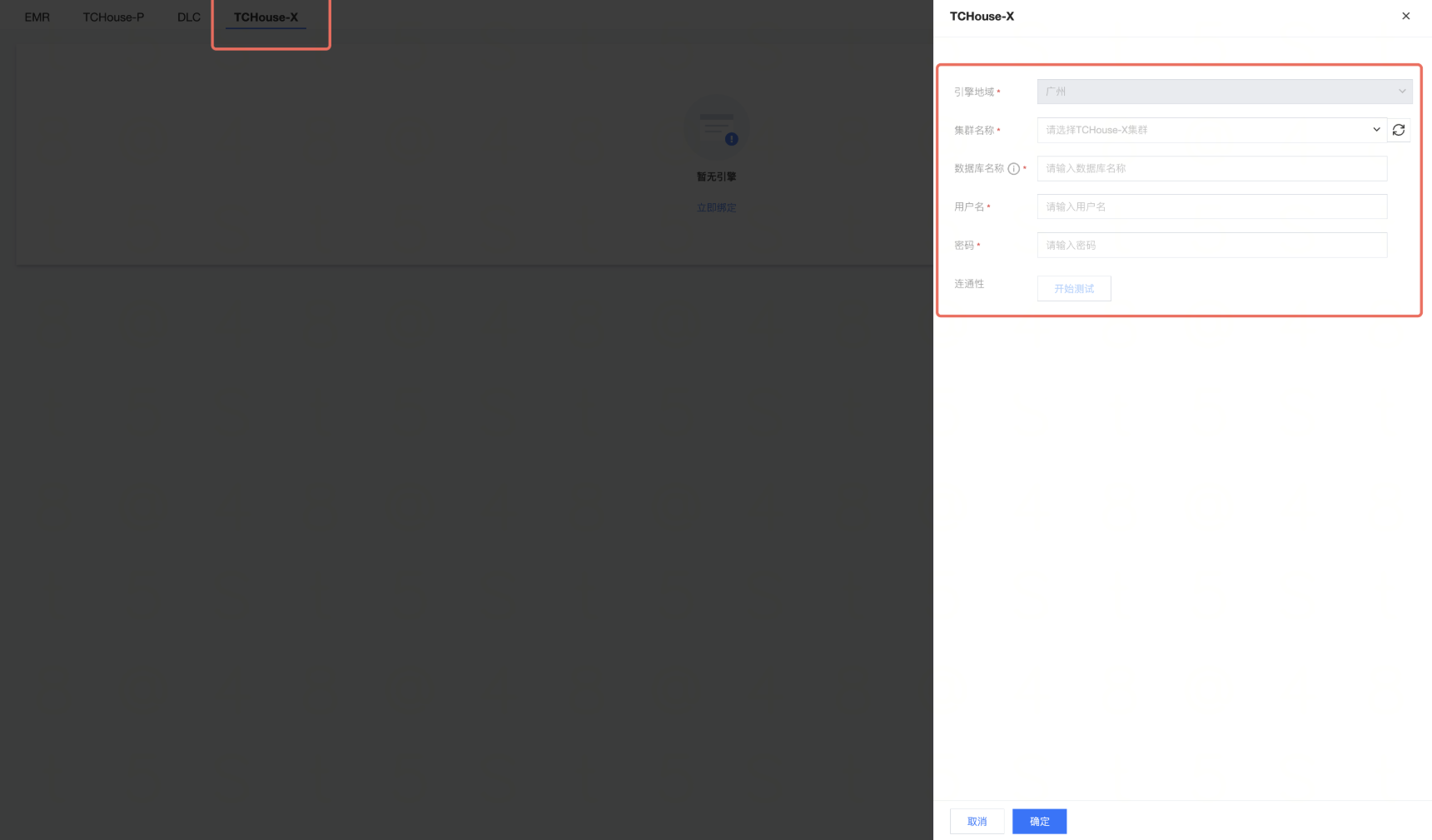 WeData | WeData 在存算引擎配置中需要绑定 TCHouse-X 实例。 ![]() 进入WeData控制台,进入存算引擎配置打开TCHouse-X菜单: ![]() 绑定集群时需要集群用户名与密码,在对应 TCHouse-X 集群下的权限管理中可以创建。 ![]() |