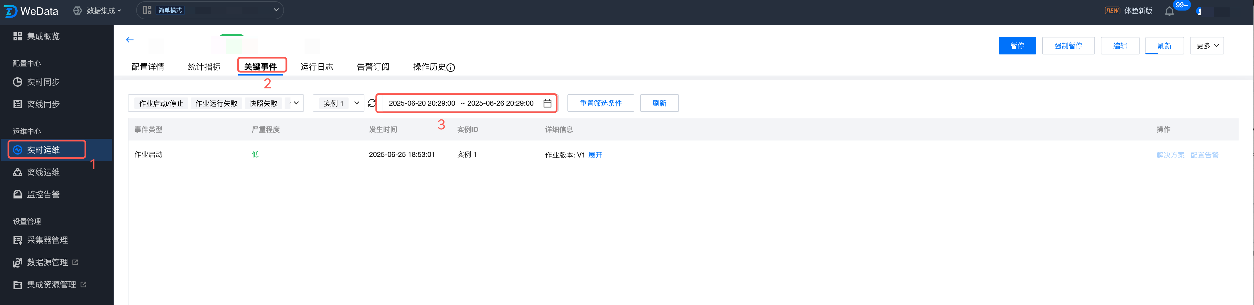 查看作业的关键事件。首先选择最近一段时间,查看作业运行失败/快照失败等事件,如果存在作业失败,可以展开查看失败原因,需要查看更多信息,则可以复制异常事件的关键字到下一步查看详细日志信息。如没有运行失败/快照失败等异常事件,则跳转到第三步。