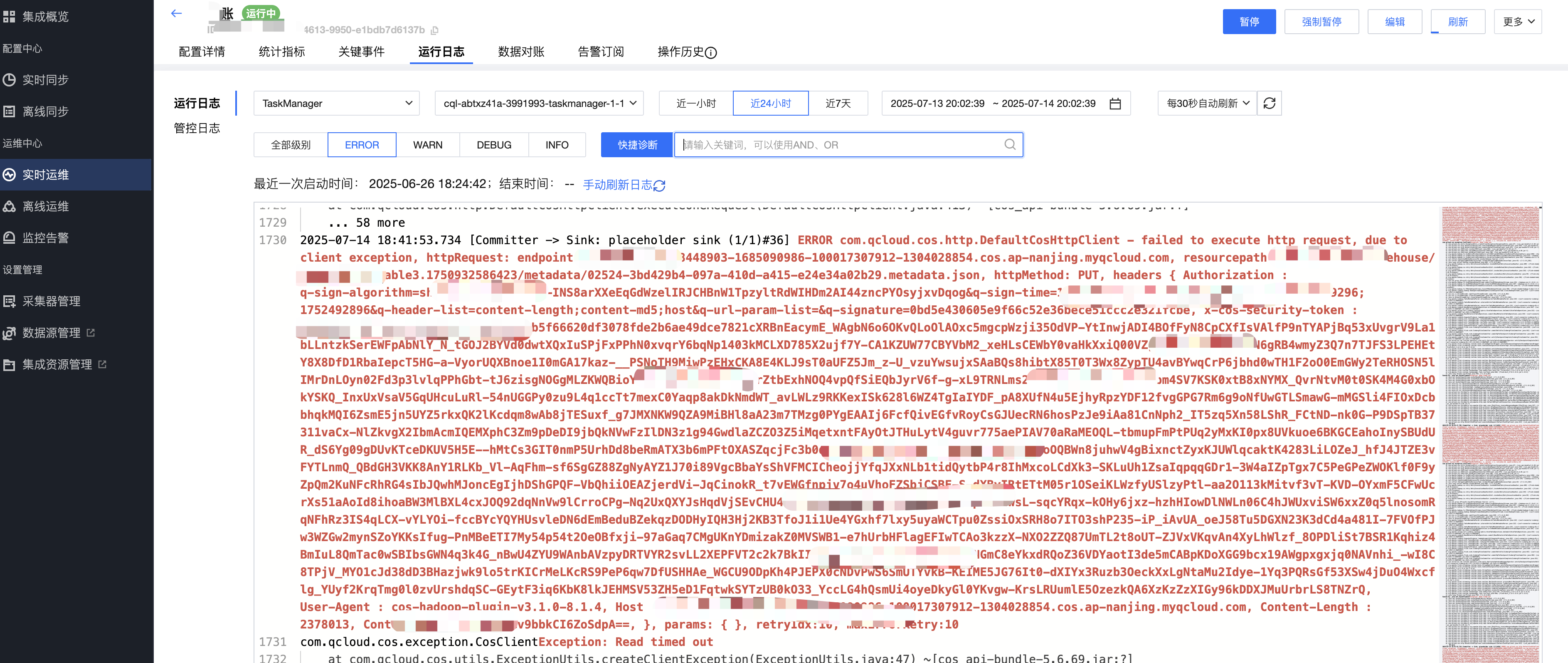 在运行日志页面,首选选择时间段,查看是否有相关 ERROR/WARN 级别的异常日志。也可以根据关键事件中的关键字或者其他关键字进行搜索,找到异常日志信息,确定任务异常原因。
