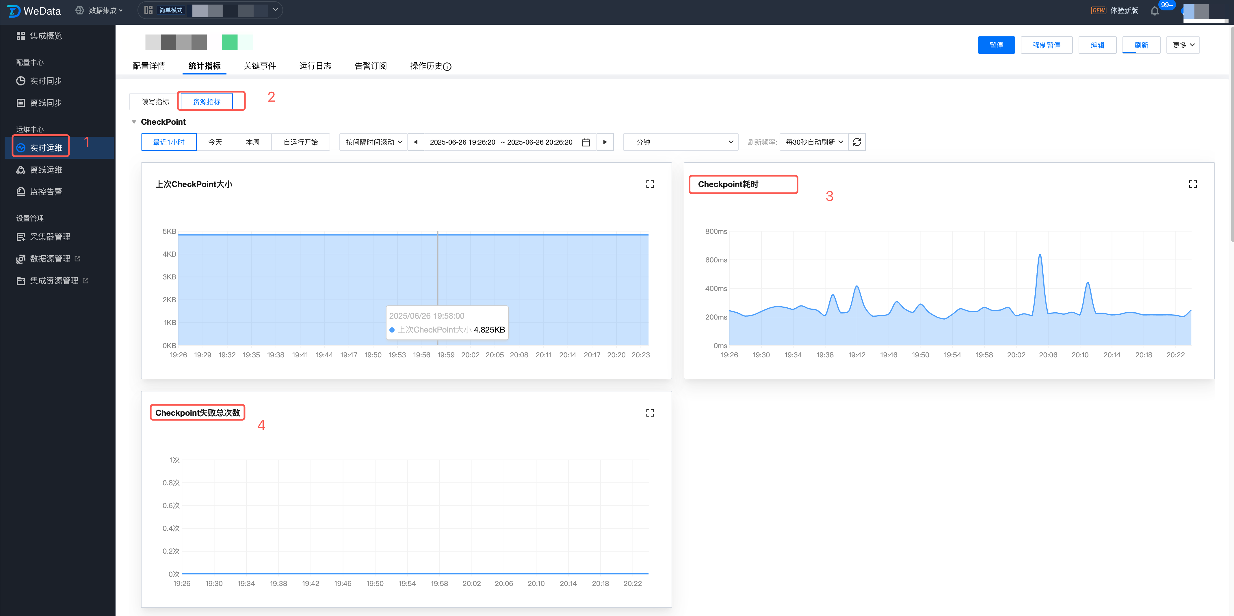 如果负载不高,则进一步查看快照生成是否正常。checkpoint 耗时一般小于快照间隔的30%。例如 checkpoint 间隔是1min,则 checkpoint 耗时一般在20秒以内,超过20秒则可能存在异常,此时尝试增加任务配置的资源或者调大快照间隔。