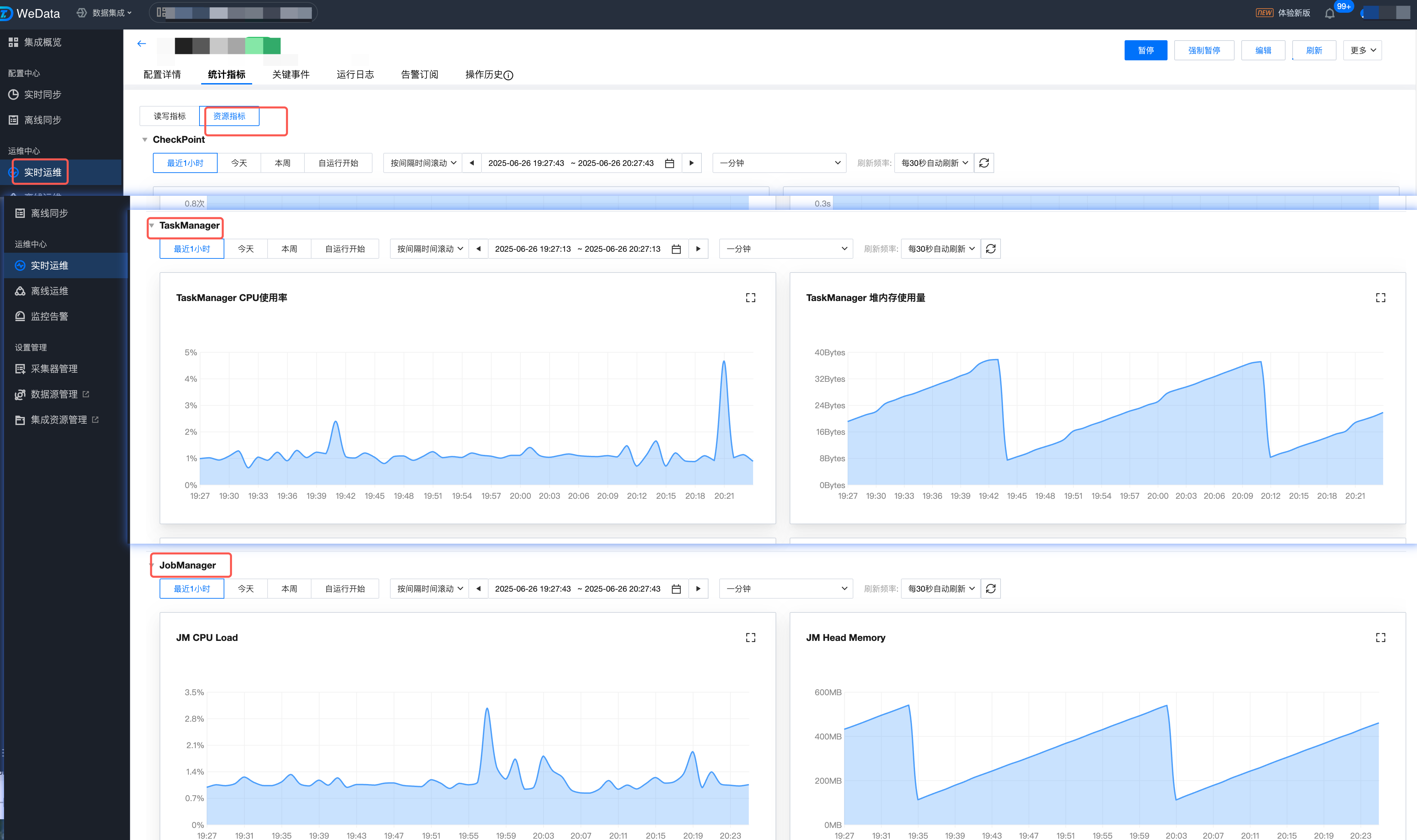 查看 TM 和 JM 的 CPU 和内存相关监控信息。如果负载较高,则需要扩容任务的资源。
