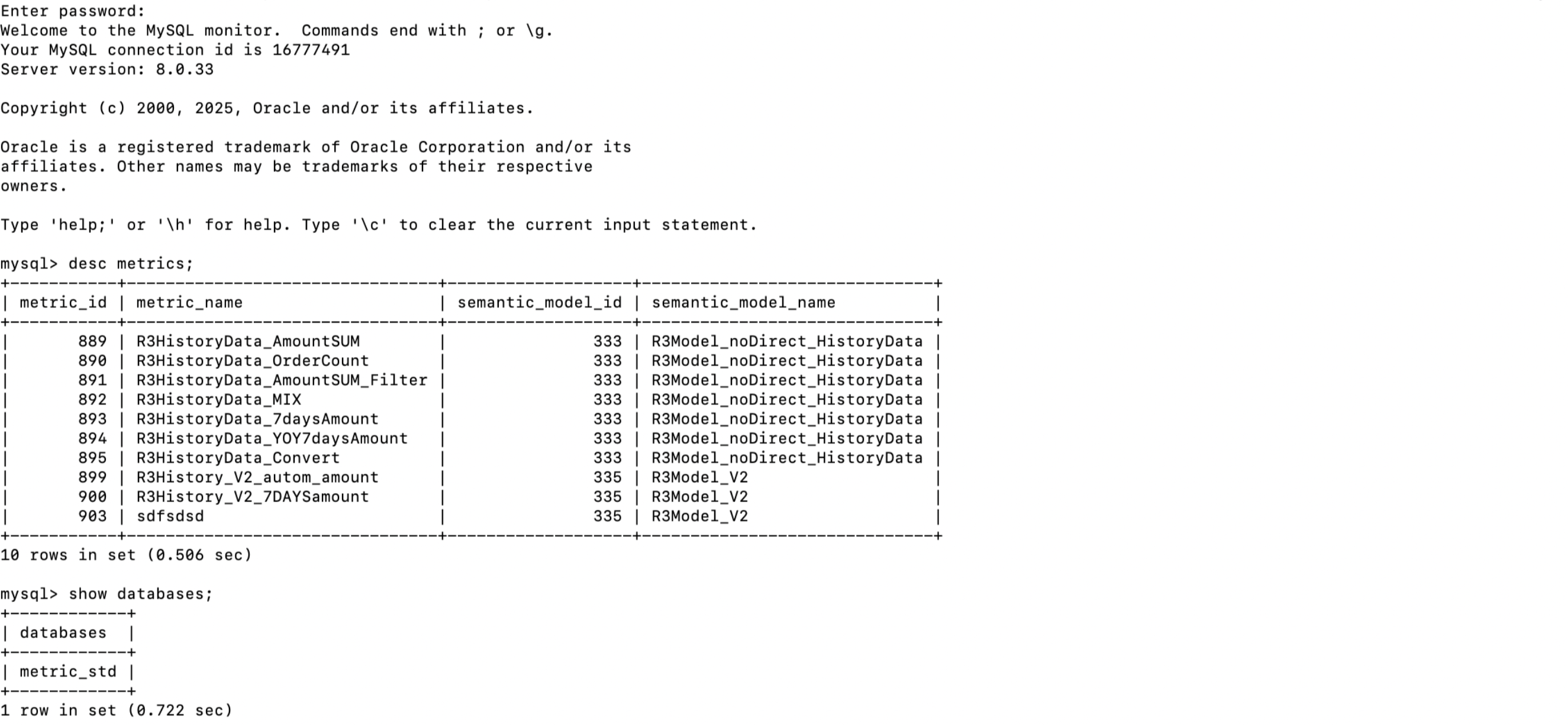 mysql -h wedata-semantics.cloud.tencent.com -P 9030 -uAPIDf21*****D5LtJ@ap-guangzhou -Dmetric_std -p