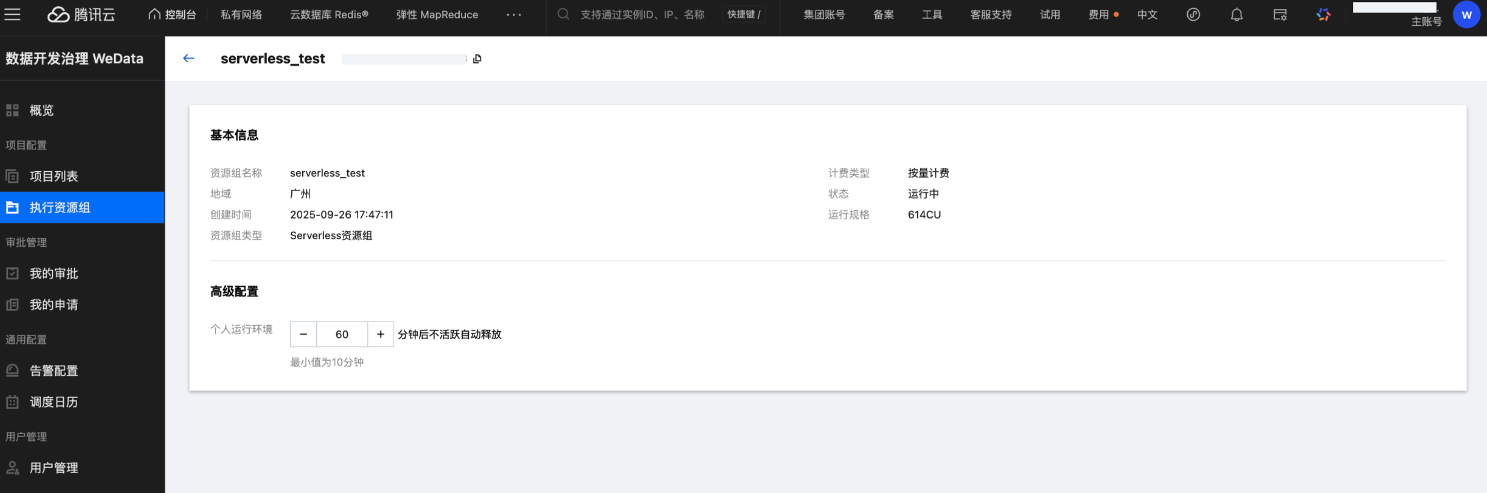 高级配置 > 个人运行环境,用于控制 WeData Studio 中个人运行环境的自动释放策略