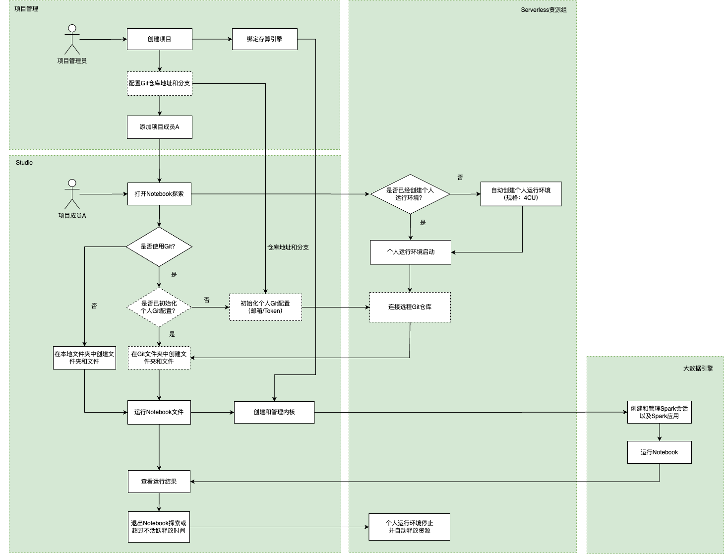 2. 基于 Serverless 资源组,提供项目和用户维度隔离的个人运行环境,确保文件权限互相隔离。