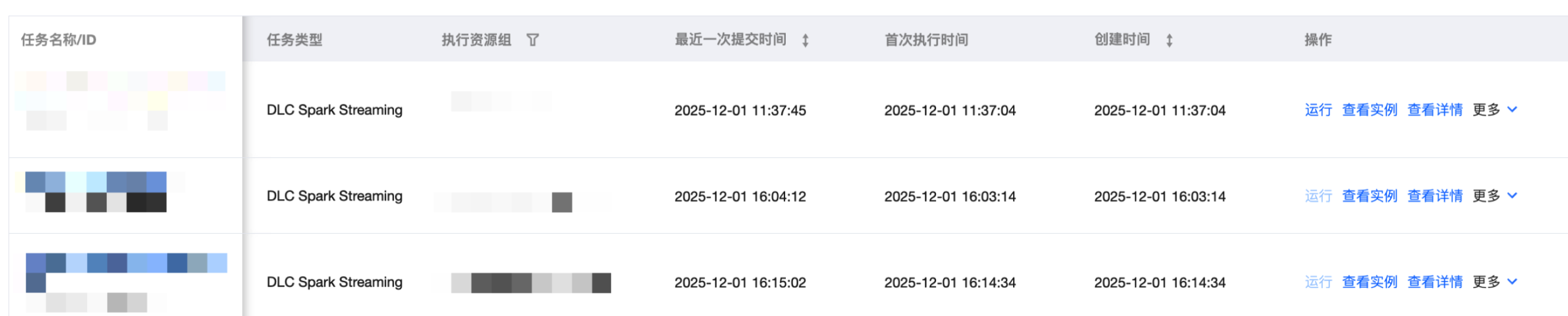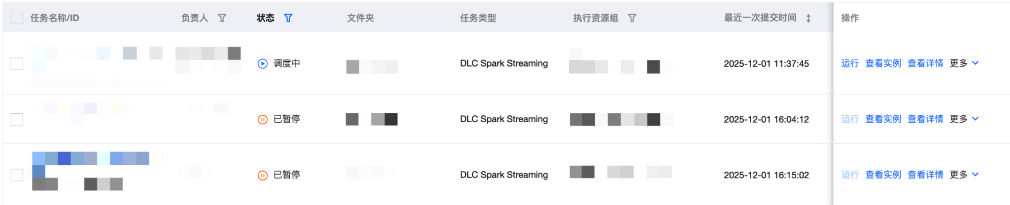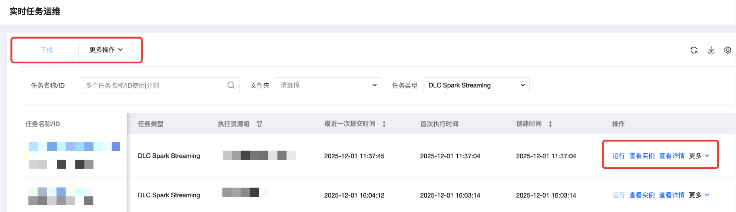 当用户在编排空间中完成 DLC Spark Streaming 等实时任务配置并提交后,即可在实时任务运维界面对 DLC Spark Streaming 进行管理和运行操作,包括对任务执行运行、下线、删除、修改负责人等操作,还包括查看实例、查看详情等功能。