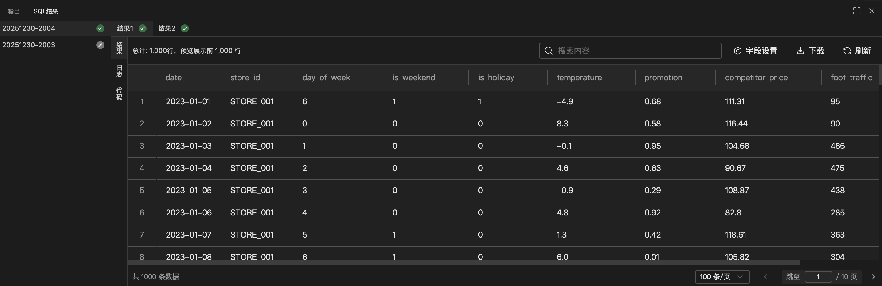 当 SQL 在 Studio 中执行完成后,执行结果将展示在结果区域。该区域用于查看查询结果、执行日志以及对应的执行代码,帮助用户快速验证 SQL 执行情况。
