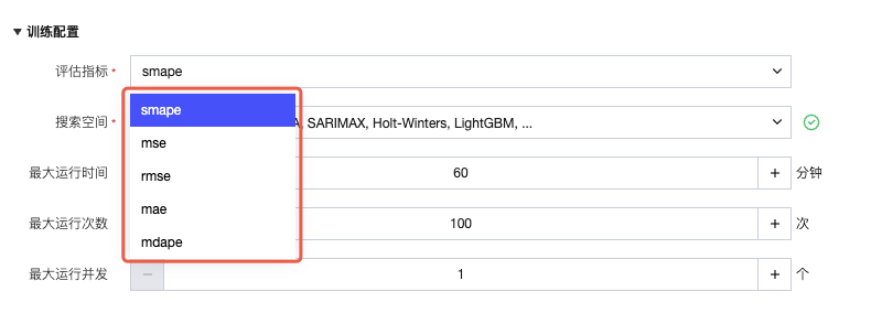 评估指标:默认 “smape”,可选 “mse”“rmse”“mae”“mdape”;