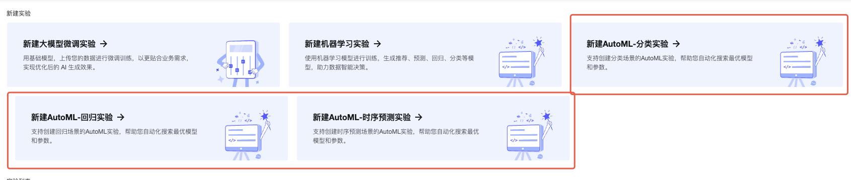 2. 页面顶部将显示 3 个 AutoML 实验入口:新建 AutoML - 分类实验、新建 AutoML - 回归实验、新建 AutoML - 时序预测实验,根据业务需求选择对应入口。