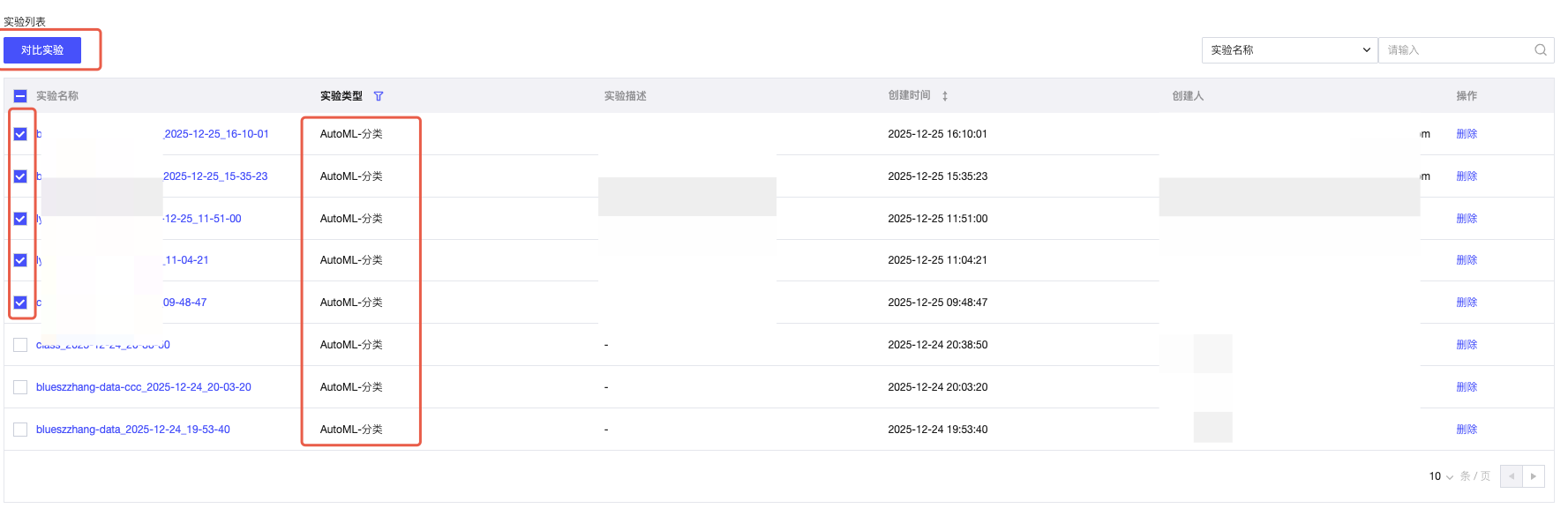 1. 相同类型的实验可以横向进行对比,在实验列表勾选相同类型的实验,单击对比实验按钮。