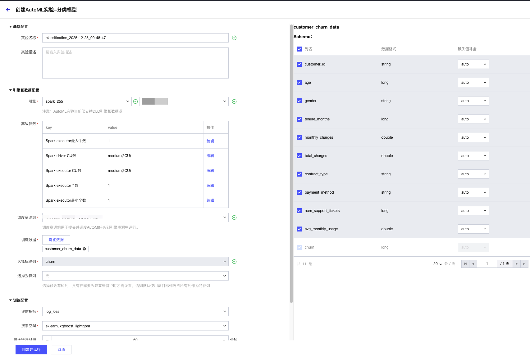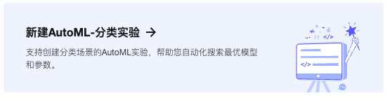 支持创建分类场景的 AutoML 实验,帮助您自动化搜索最优模型和参数。