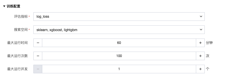 评估指标:单选(默认 “log_loss”,可选 “f1”“precision”“accuracy”“roc_auc”)。