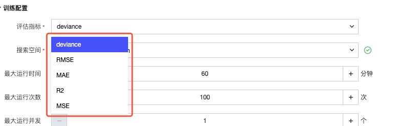 步骤 3 评估指标:默认 “deviance”,可选 “RMSE”“MAE”“R2”“MSE”。